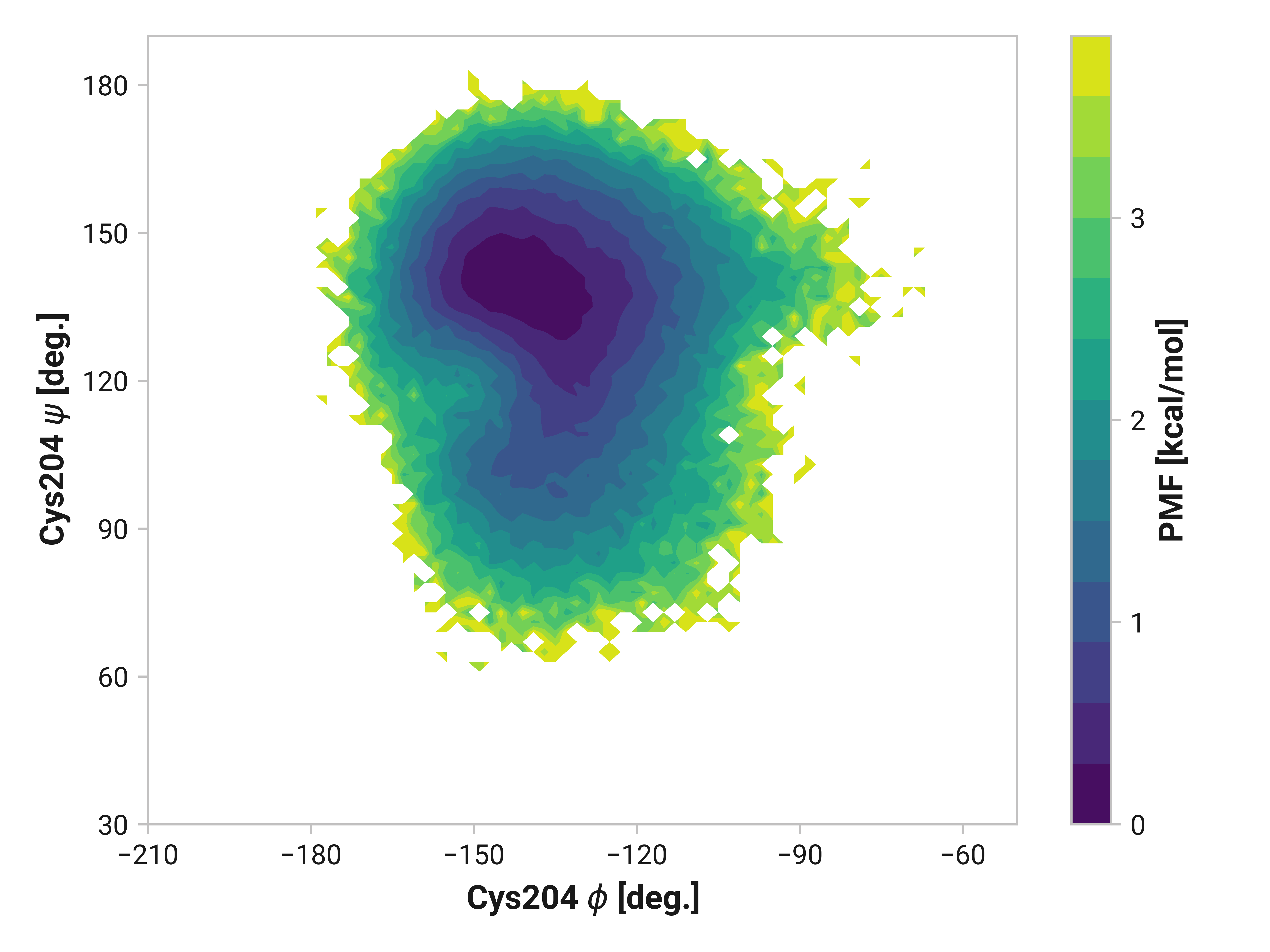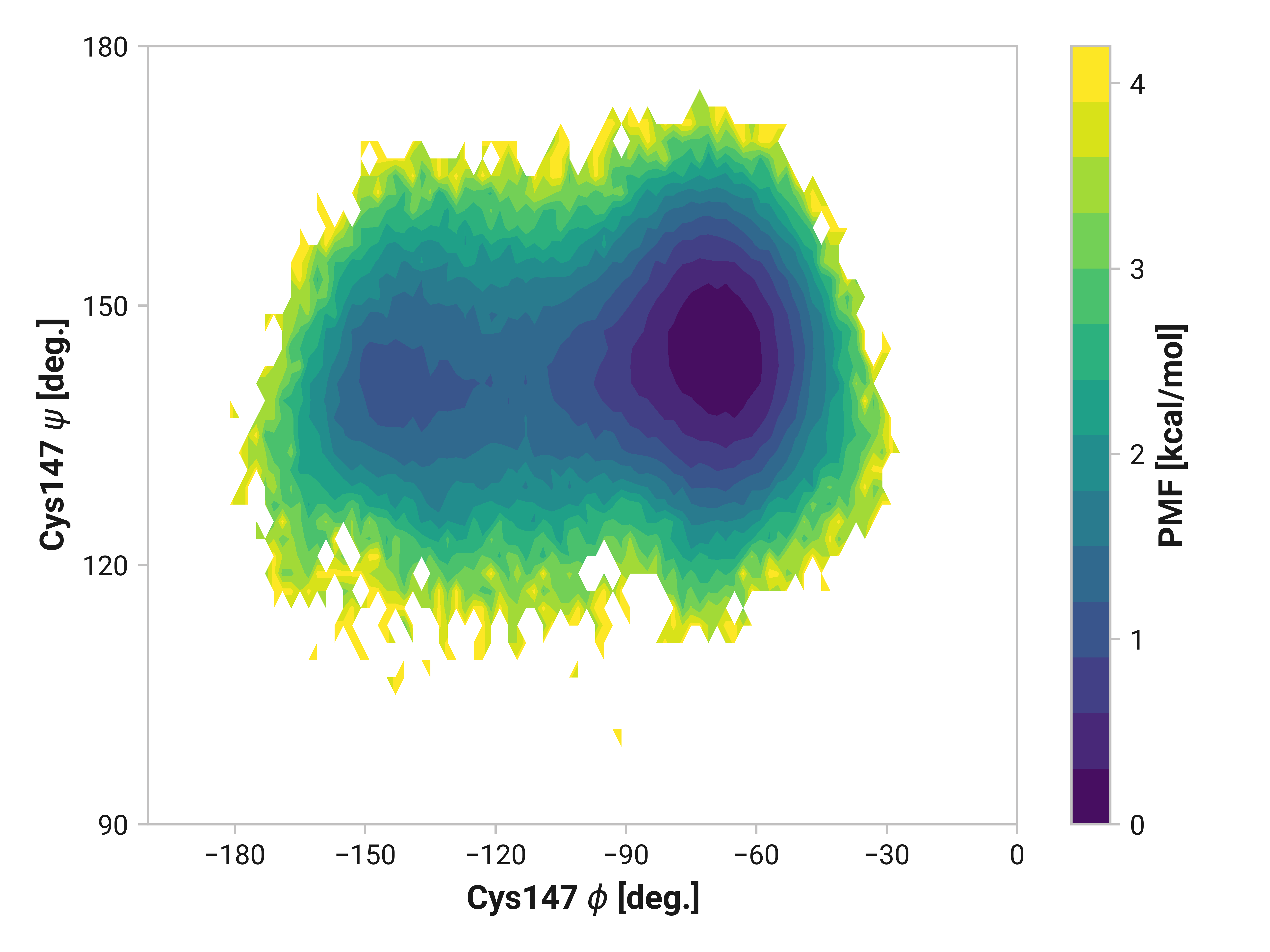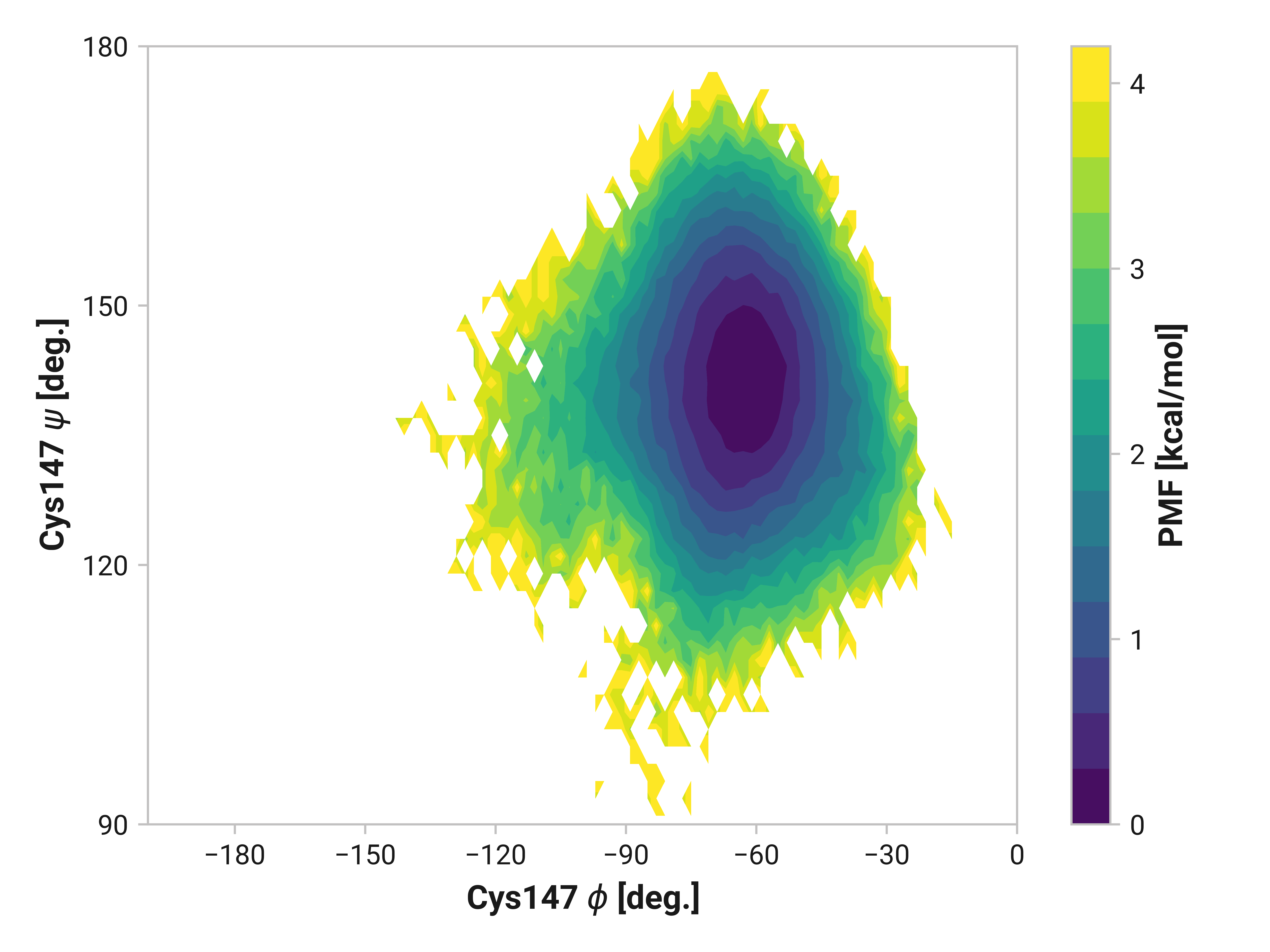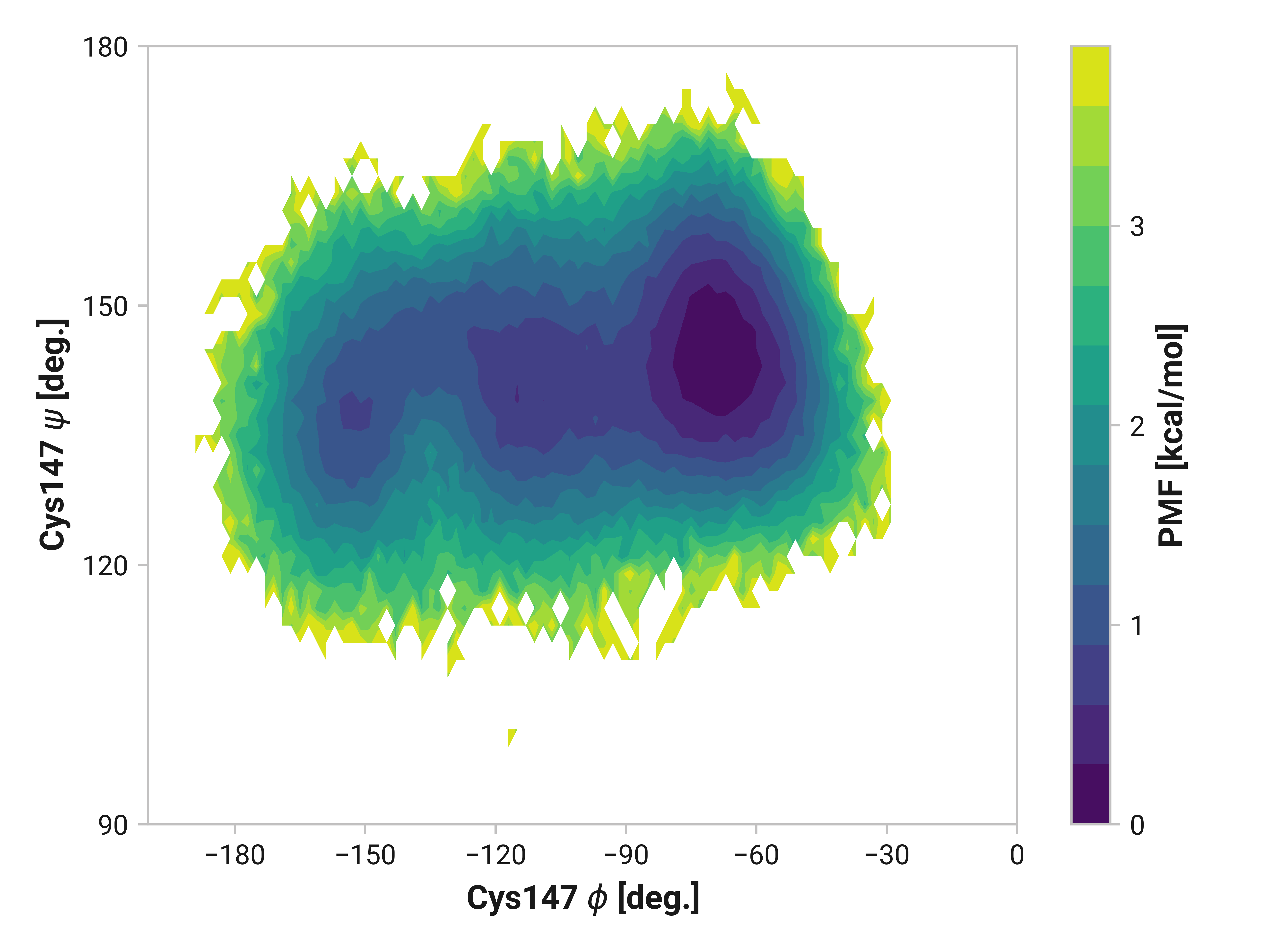 These two cystines are near residues that play a crucial role in the GFP mechanism; thus, one would expect differences in the protein backbone \(\phi\) and \(\psi\) angles. In the following sections, we show two-dimensional histograms of the potential of mean force (PMF) of these backbone angles (i.e., Ramachandran plot). We will refer to these plots as backbone PMFs.