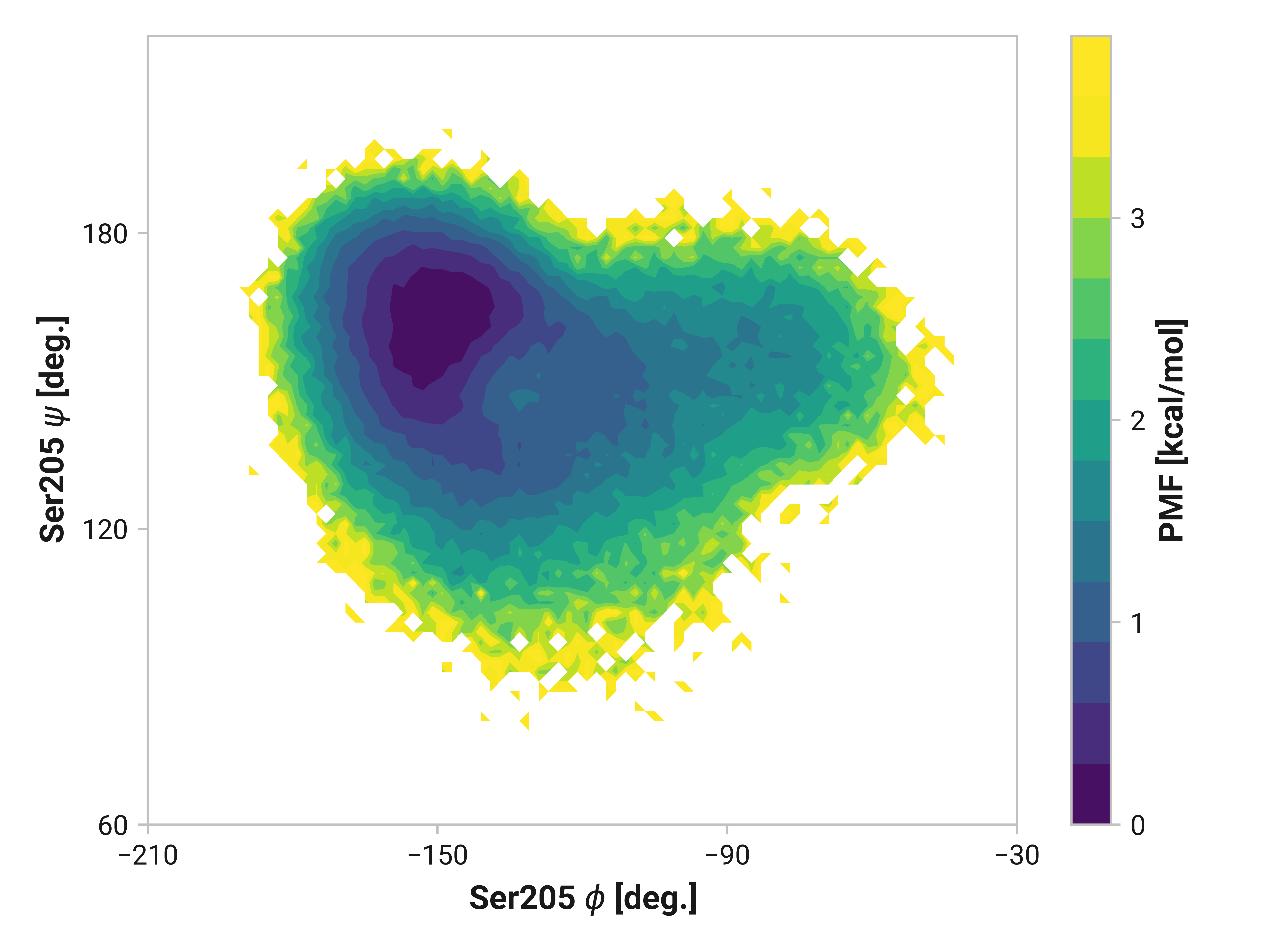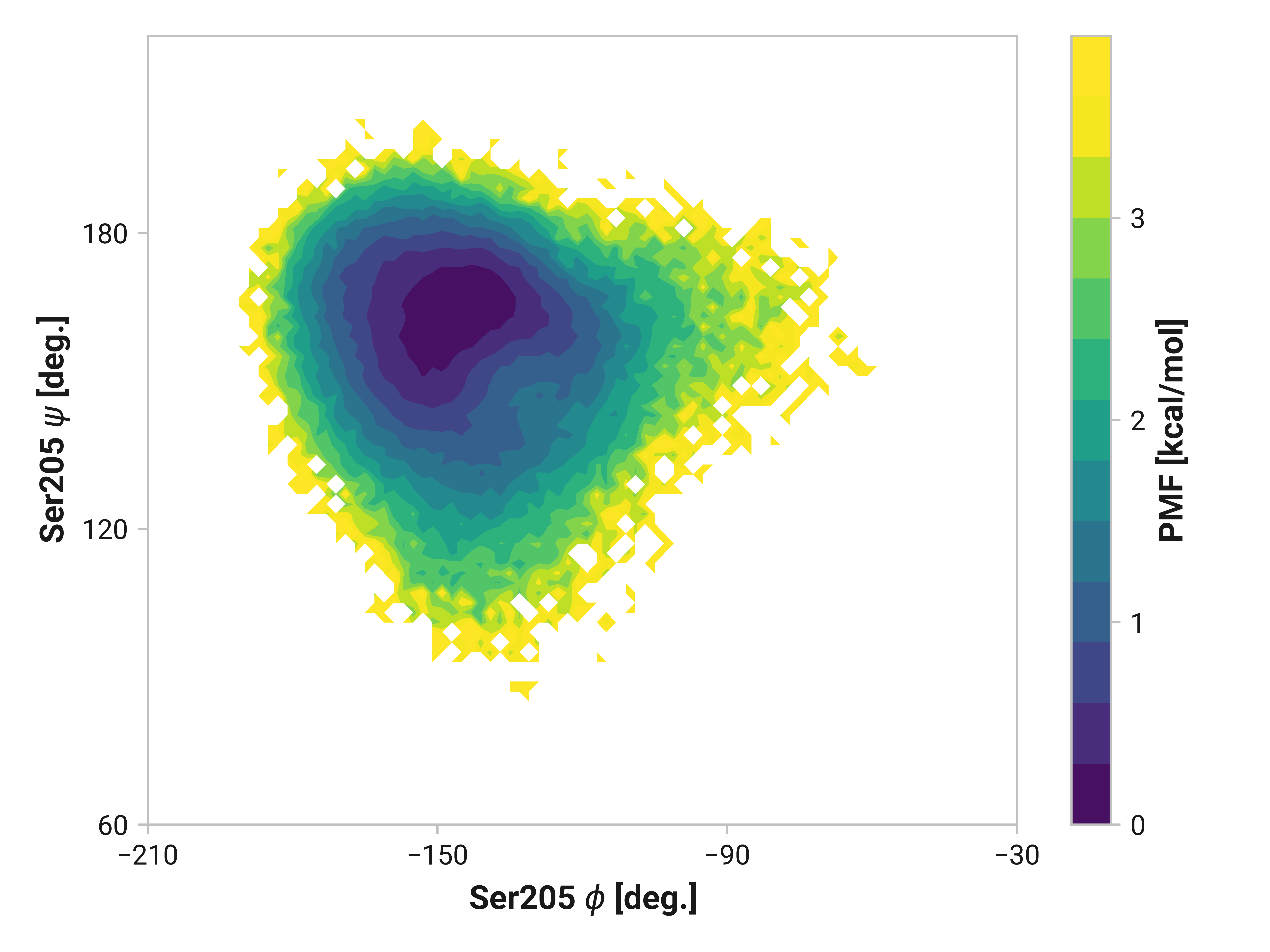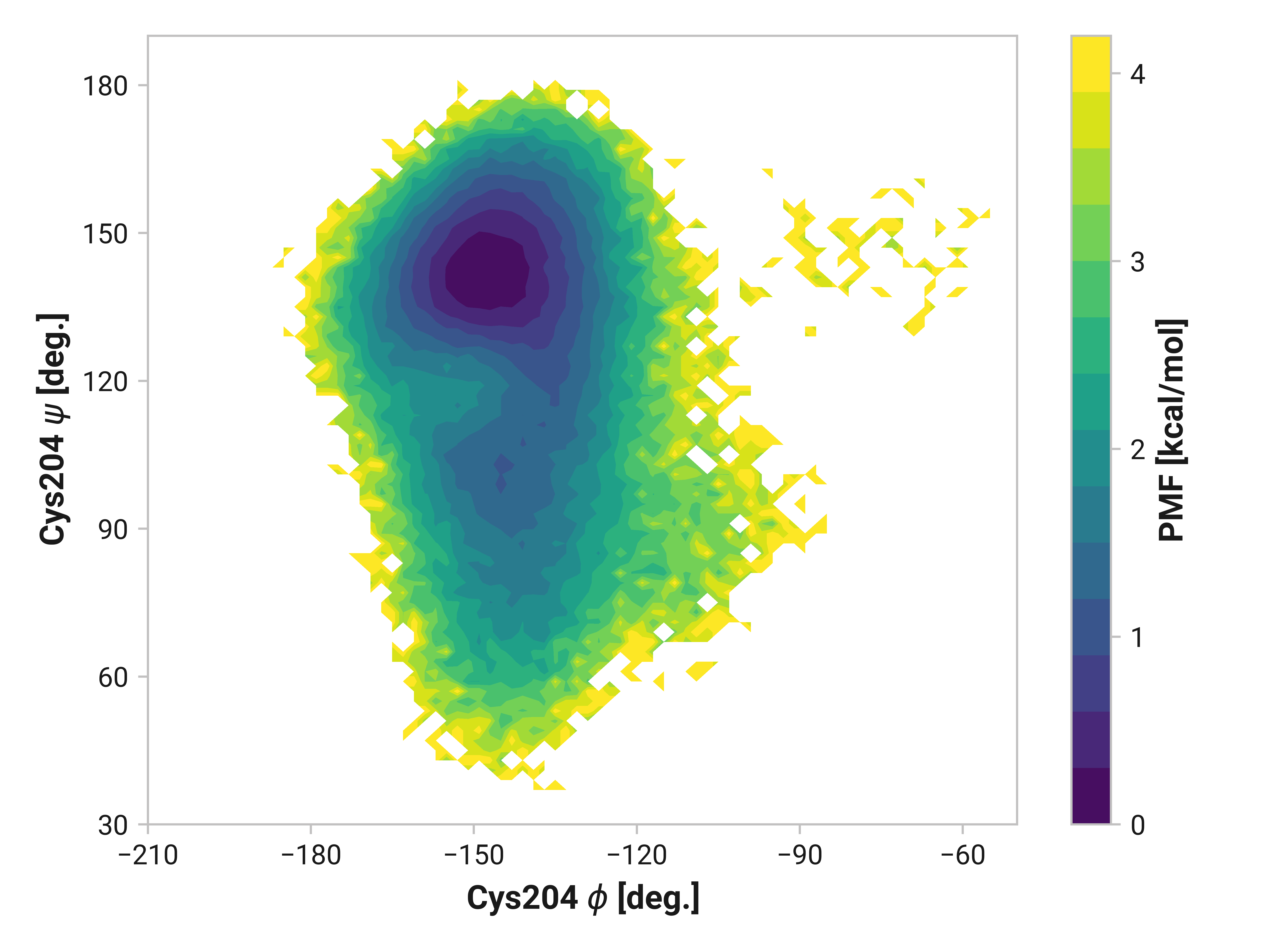 These two cystines are near residues that play a crucial role in the GFP mechanism; thus, one would expect differences in the protein backbone \(\phi\) and \(\psi\) angles. In the following sections, we show two-dimensional histograms of the potential of mean force (PMF) of these backbone angles (i.e., Ramachandran plot). We will refer to these plots as backbone PMFs.