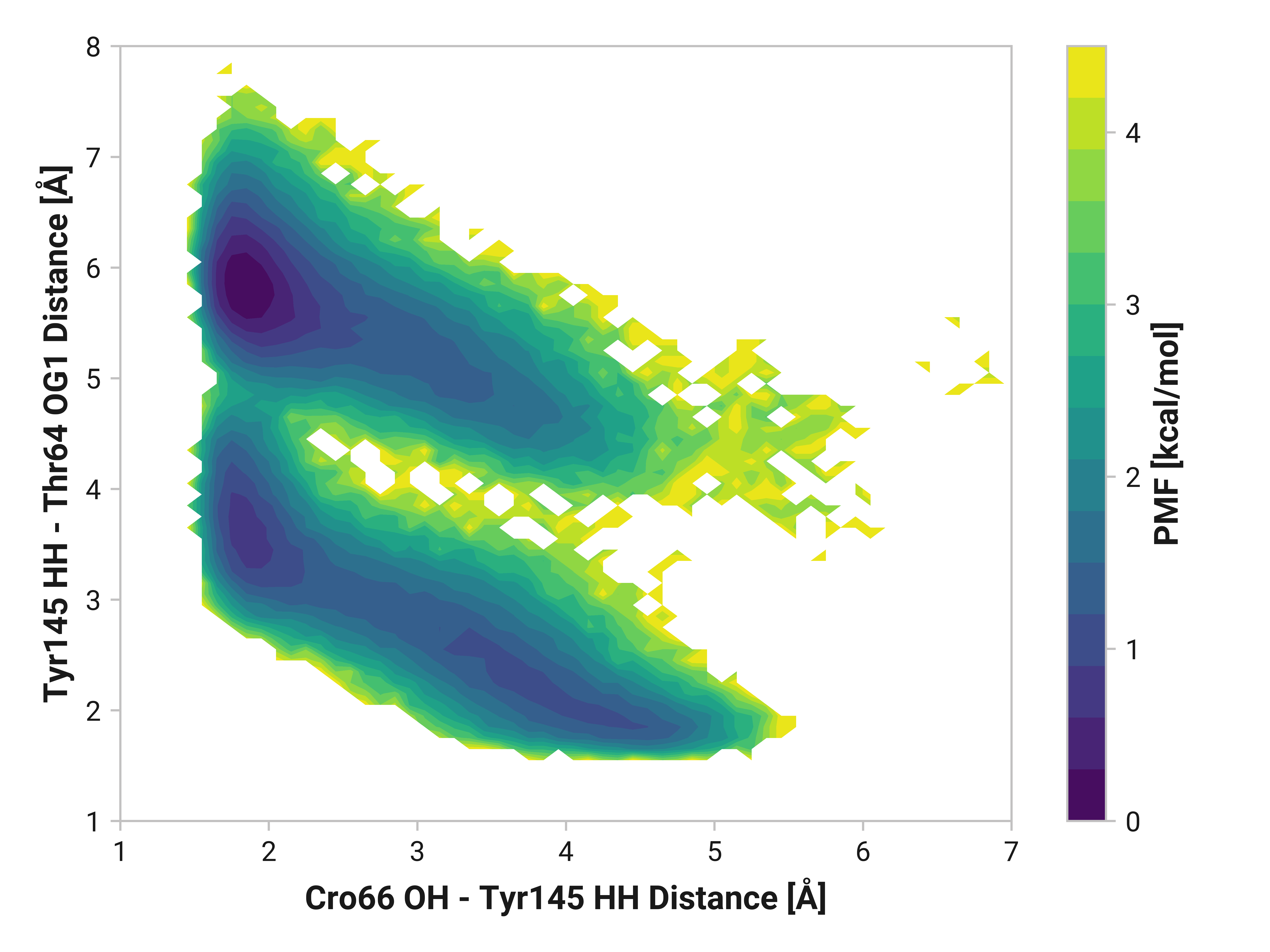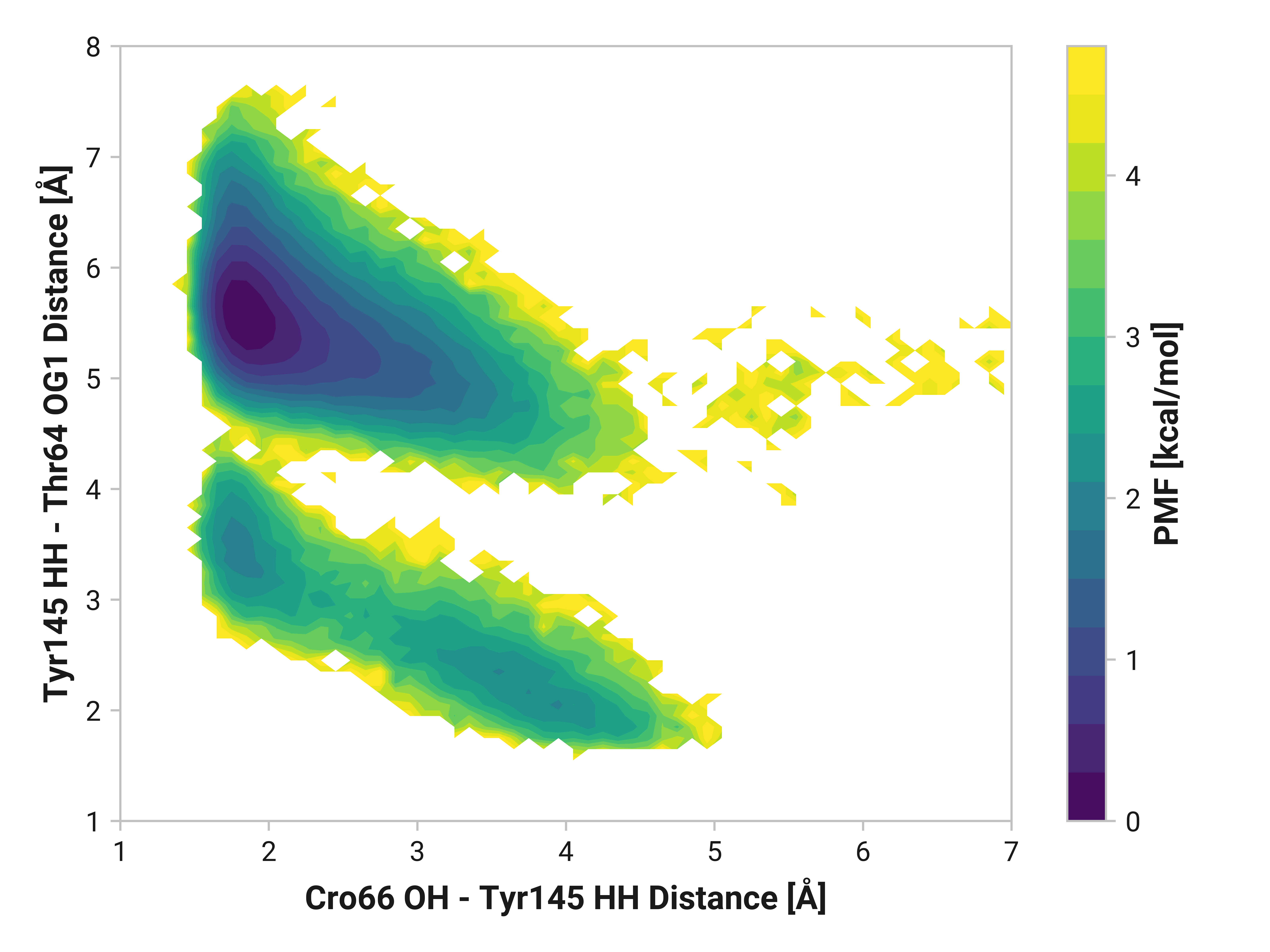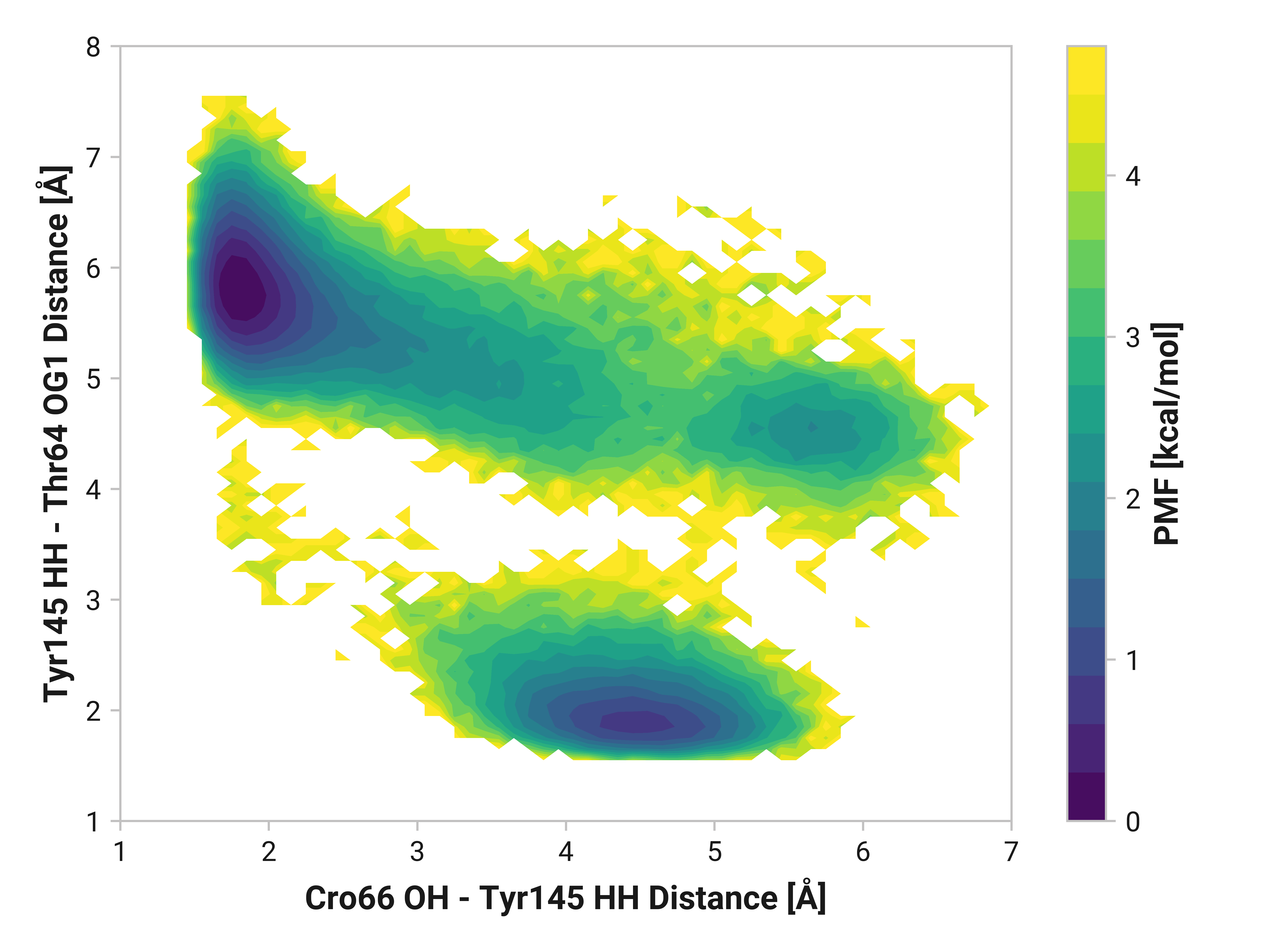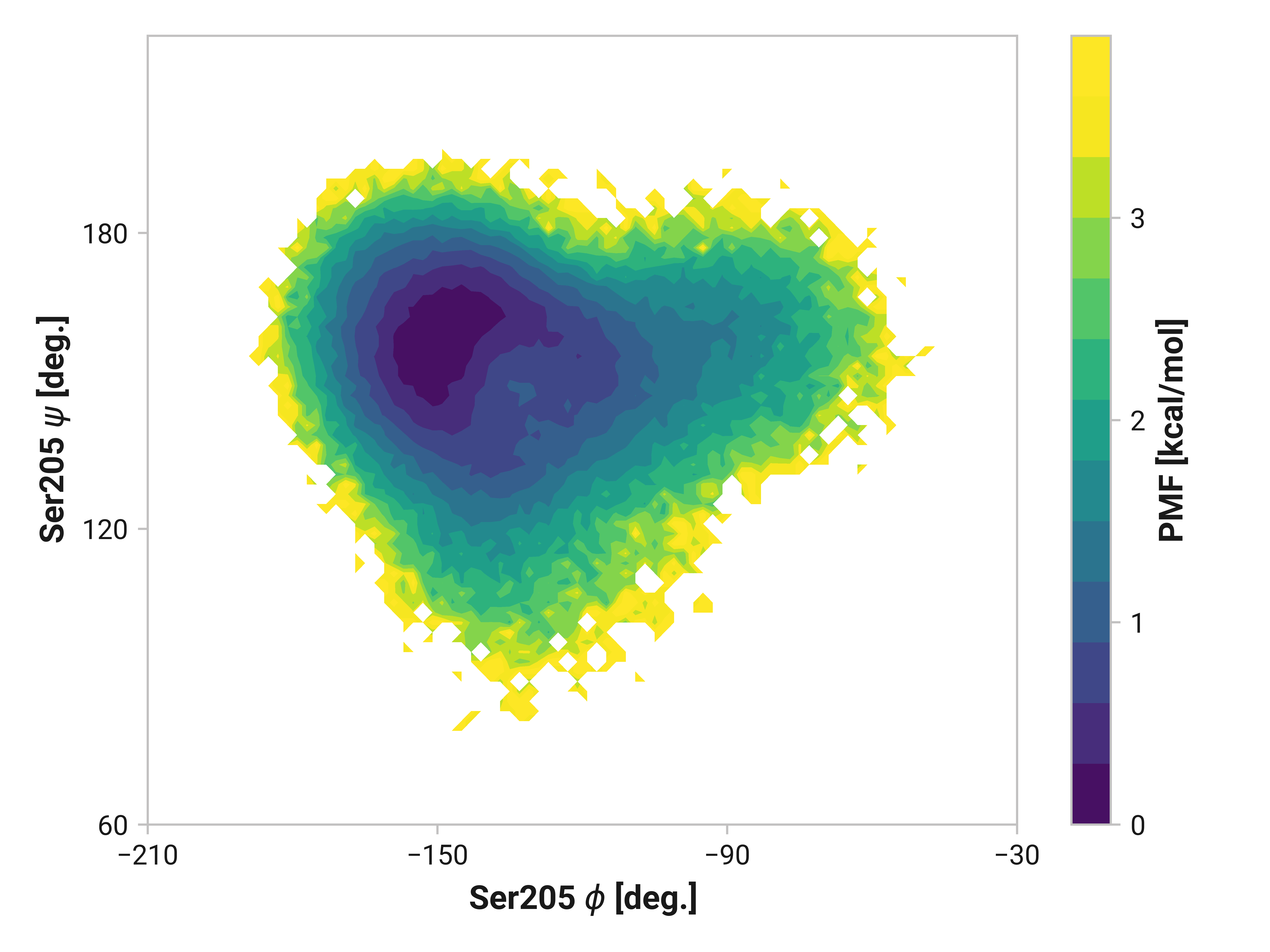 These two cystines are near residues that play a crucial role in the GFP mechanism; thus, one would expect differences in the protein backbone \(\phi\) and \(\psi\) angles. In the following sections, we show two-dimensional histograms of the potential of mean force (PMF) of these backbone angles (i.e., Ramachandran plot). We will refer to these plots as backbone PMFs.