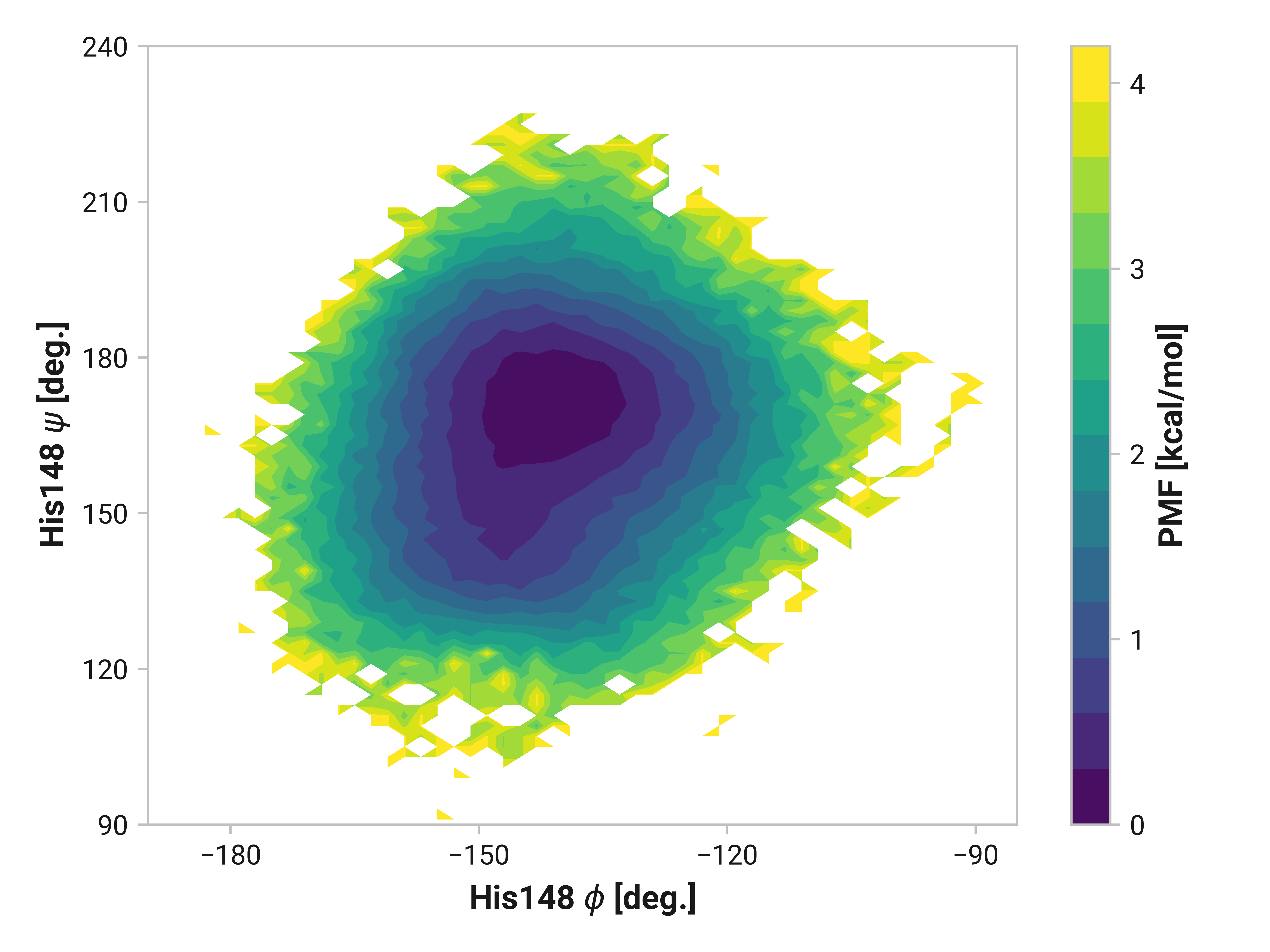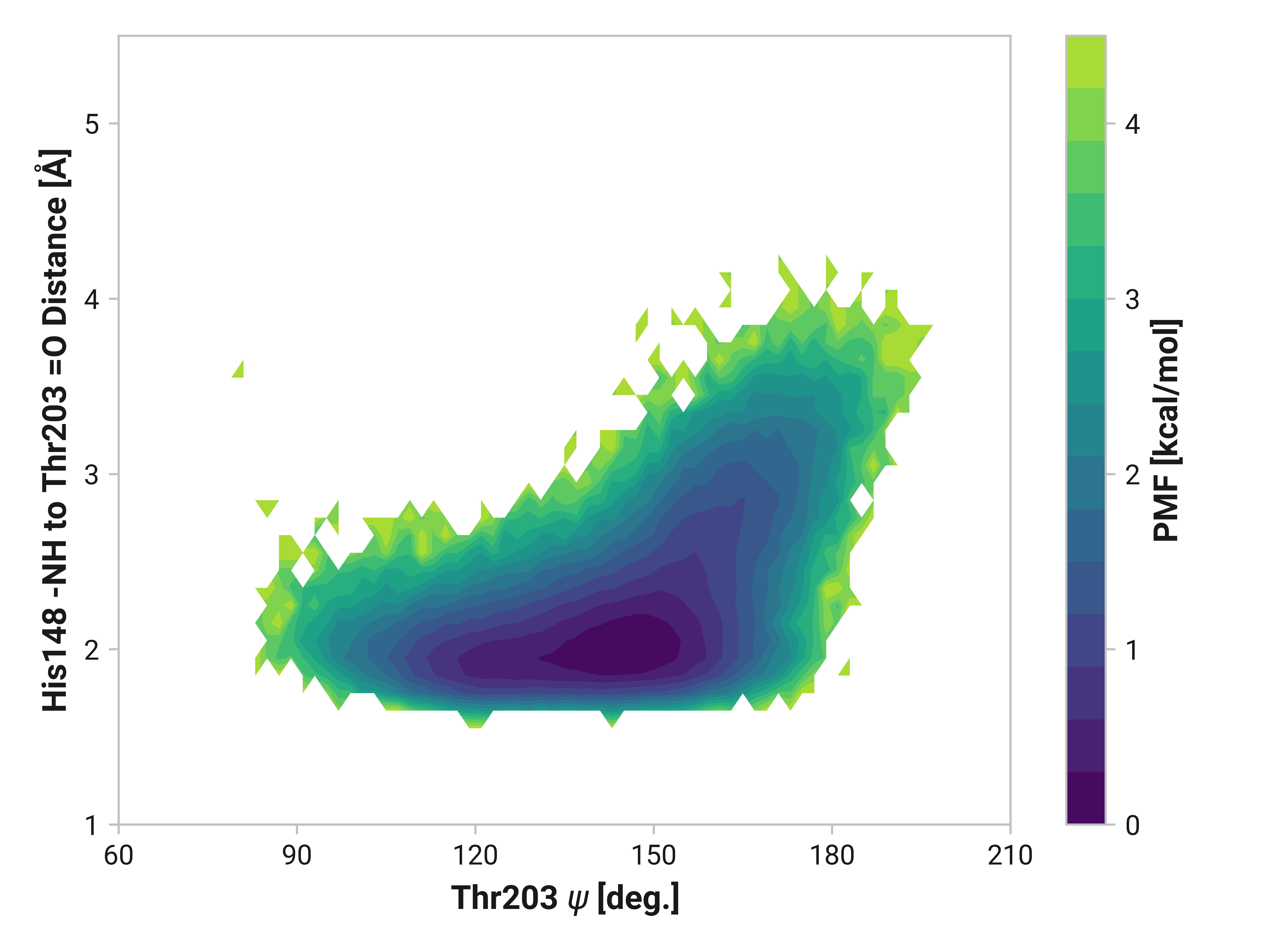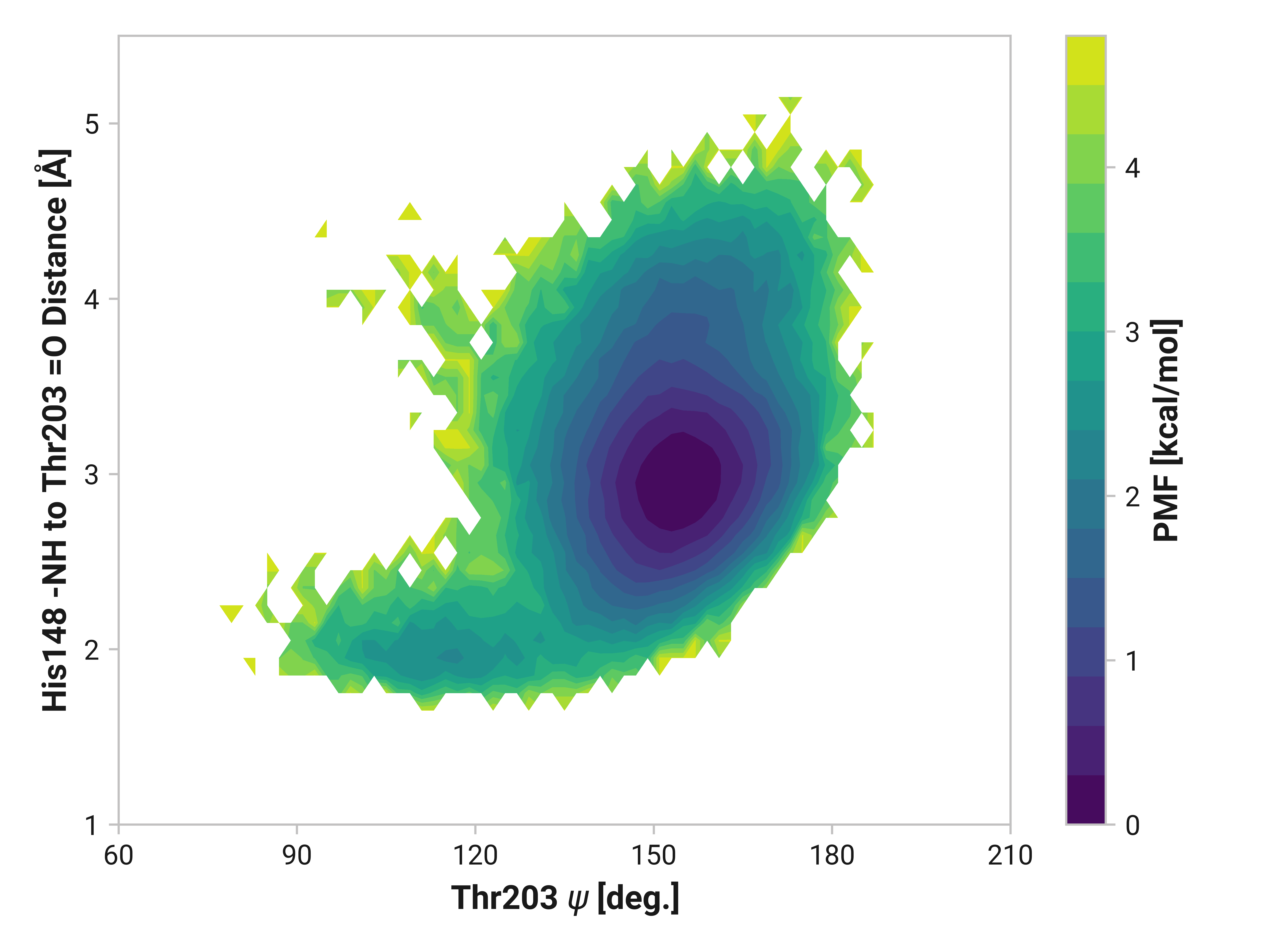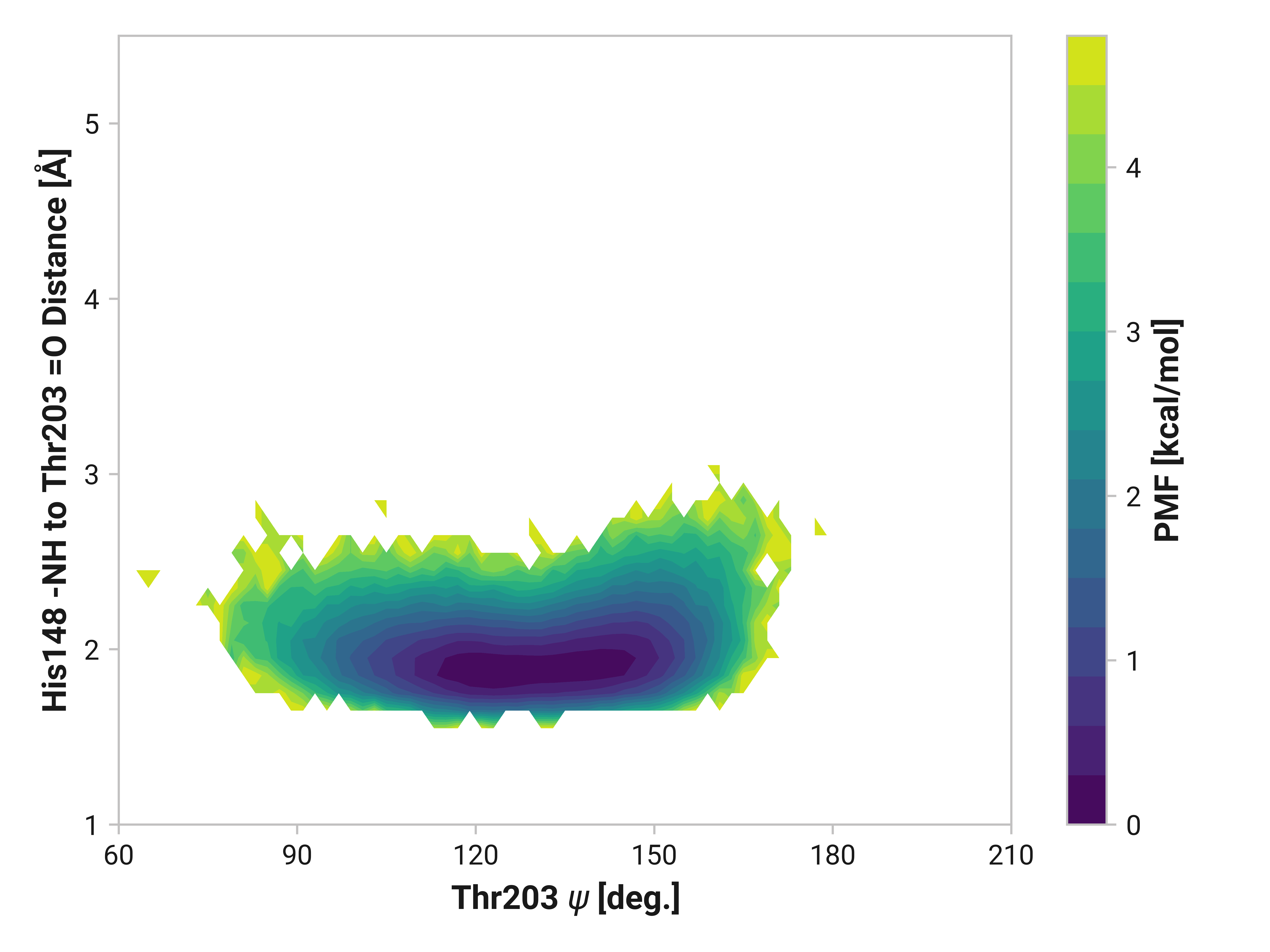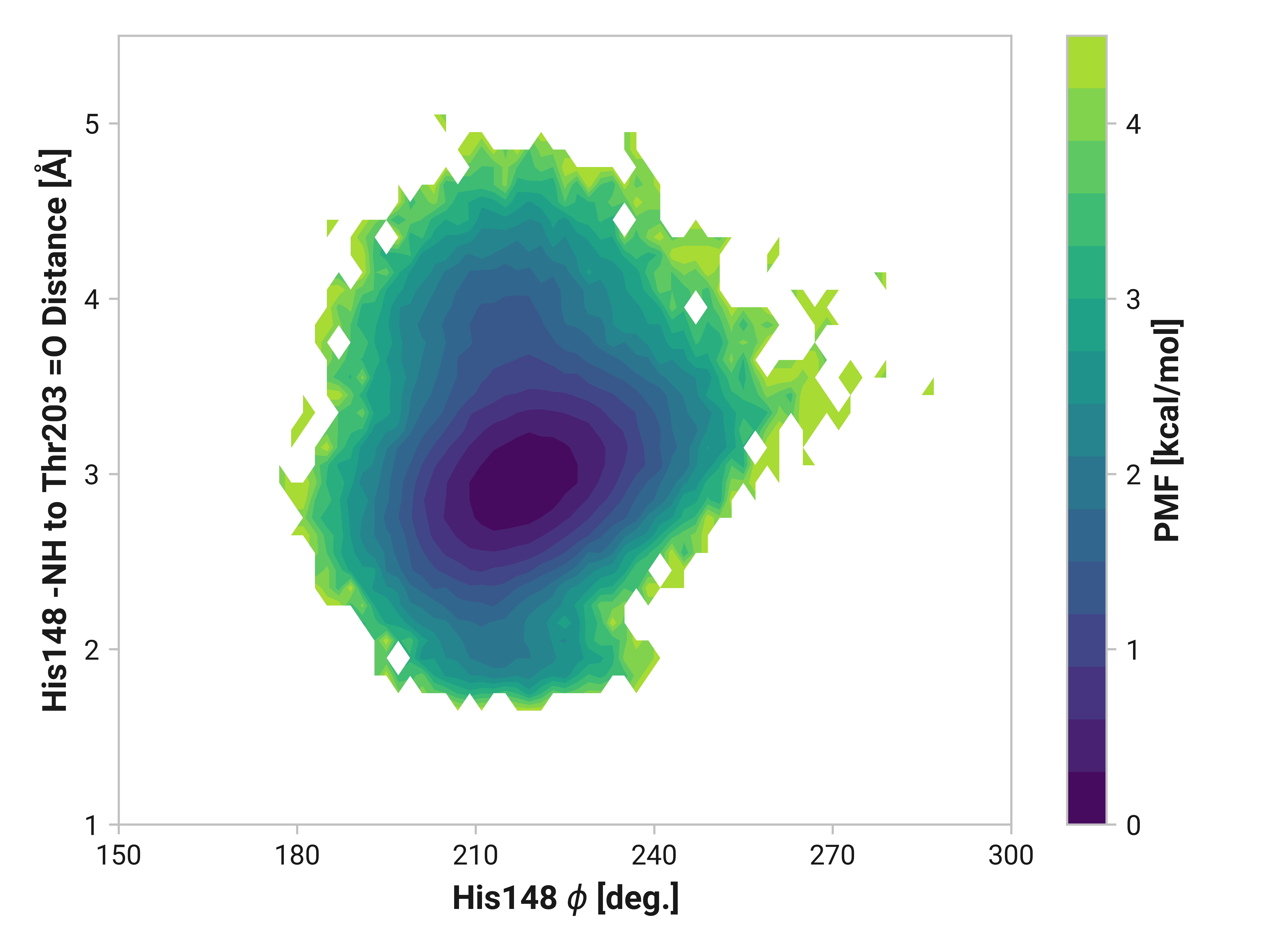 We can elucidate the mechanism by plotting 2D histograms of this His148 -NH to Thr203 =O distance with respect to relevant dihedral angles. If correlated, we would see distinct patterns in the PMFs.