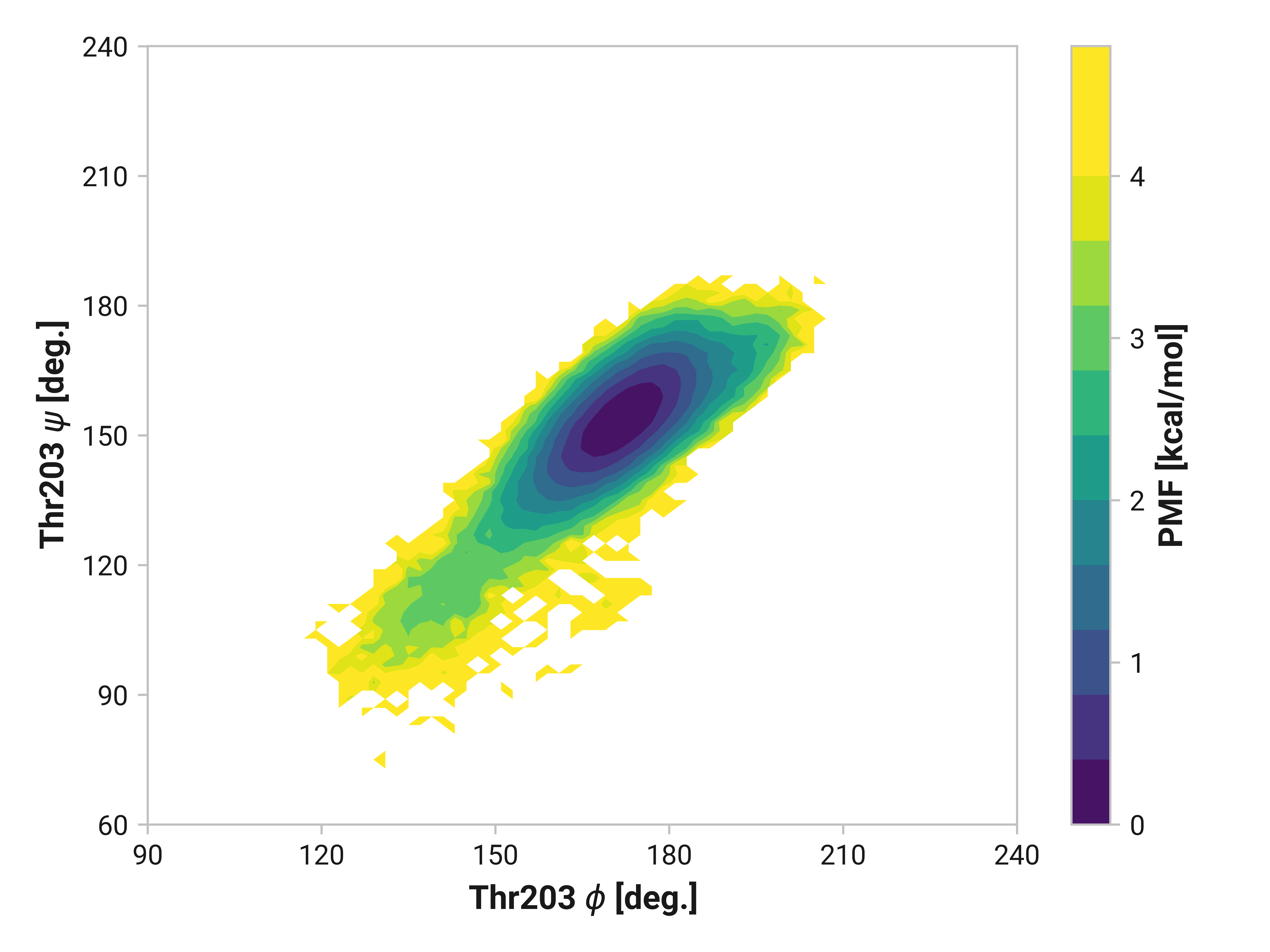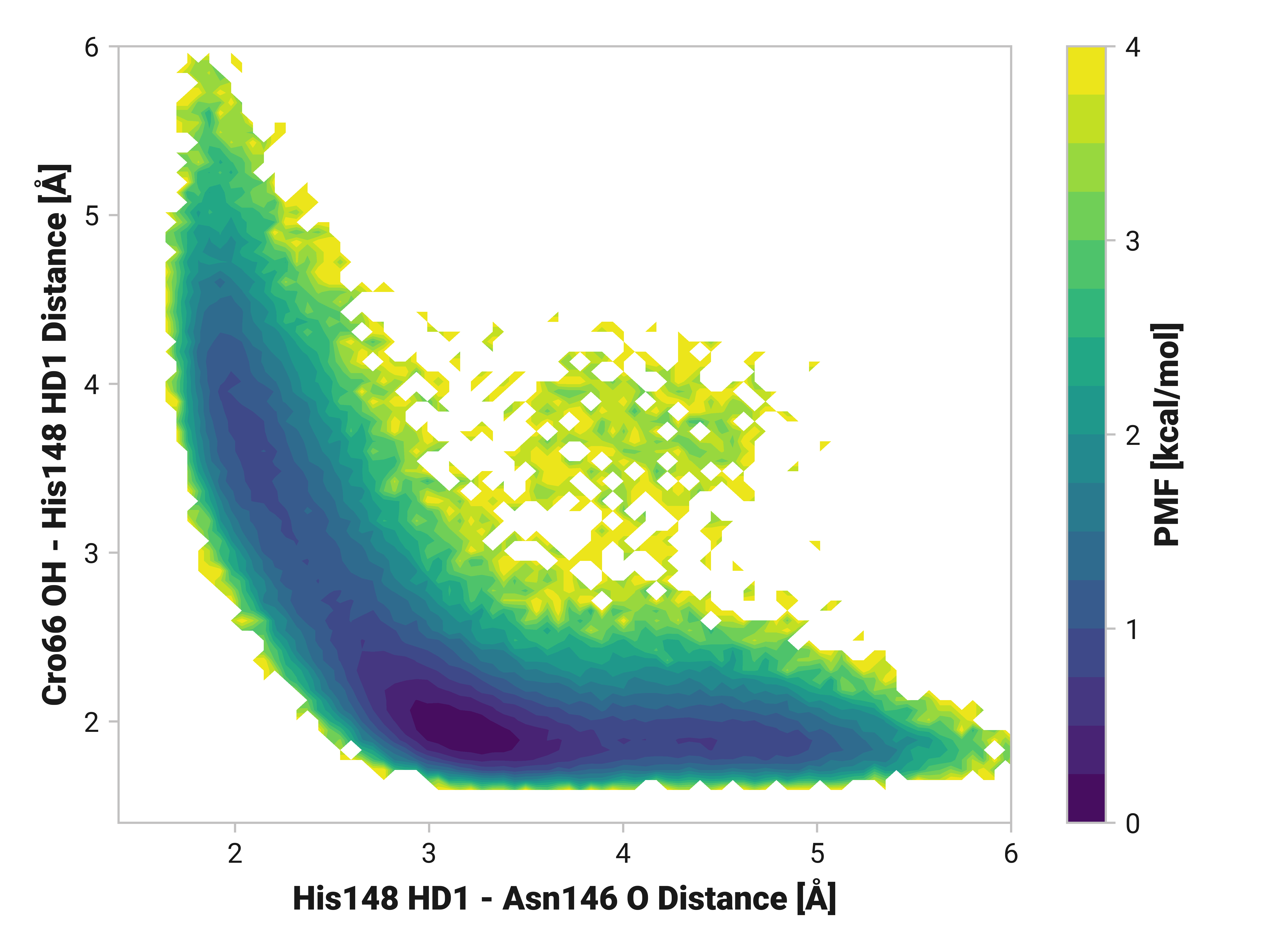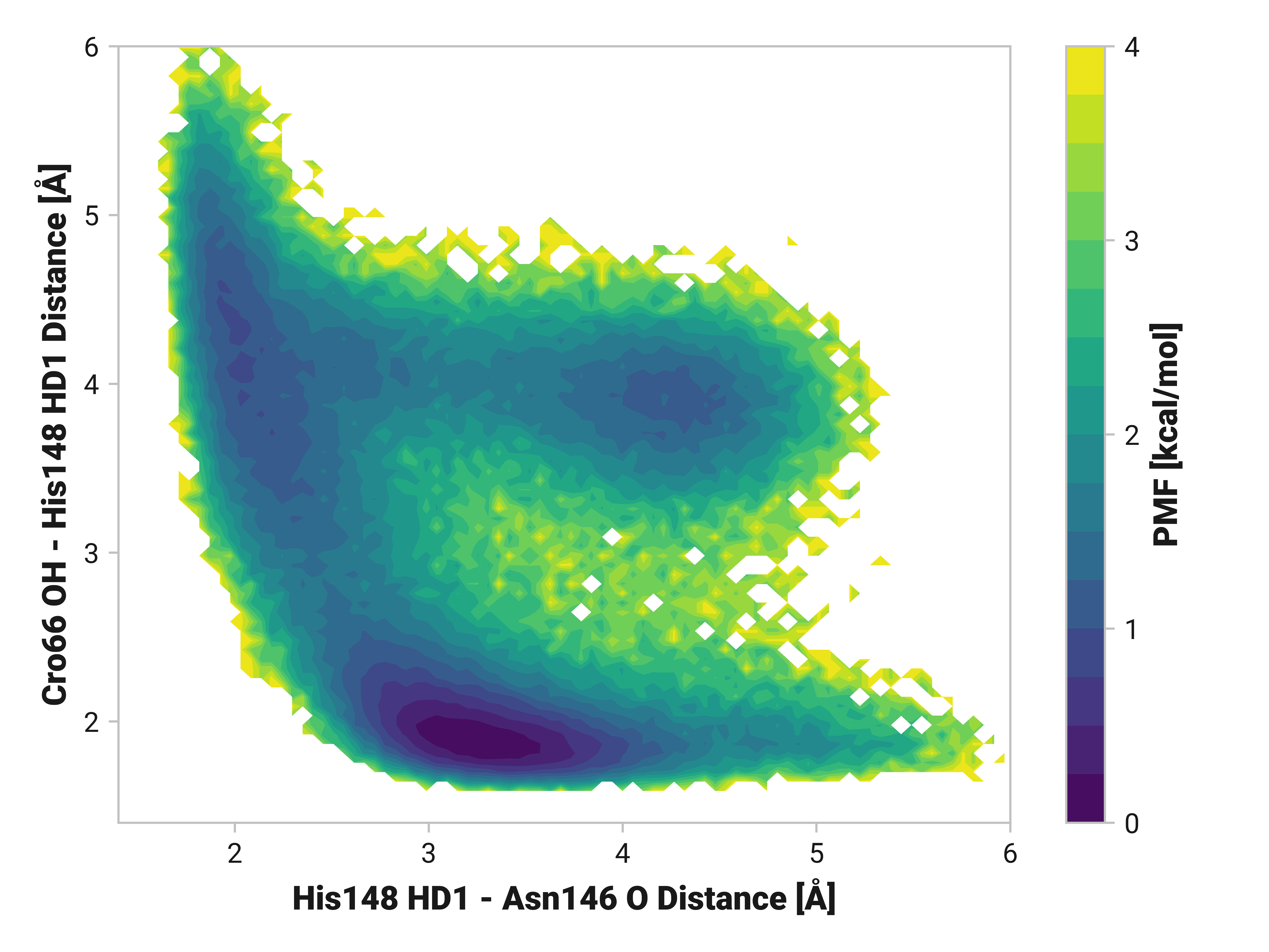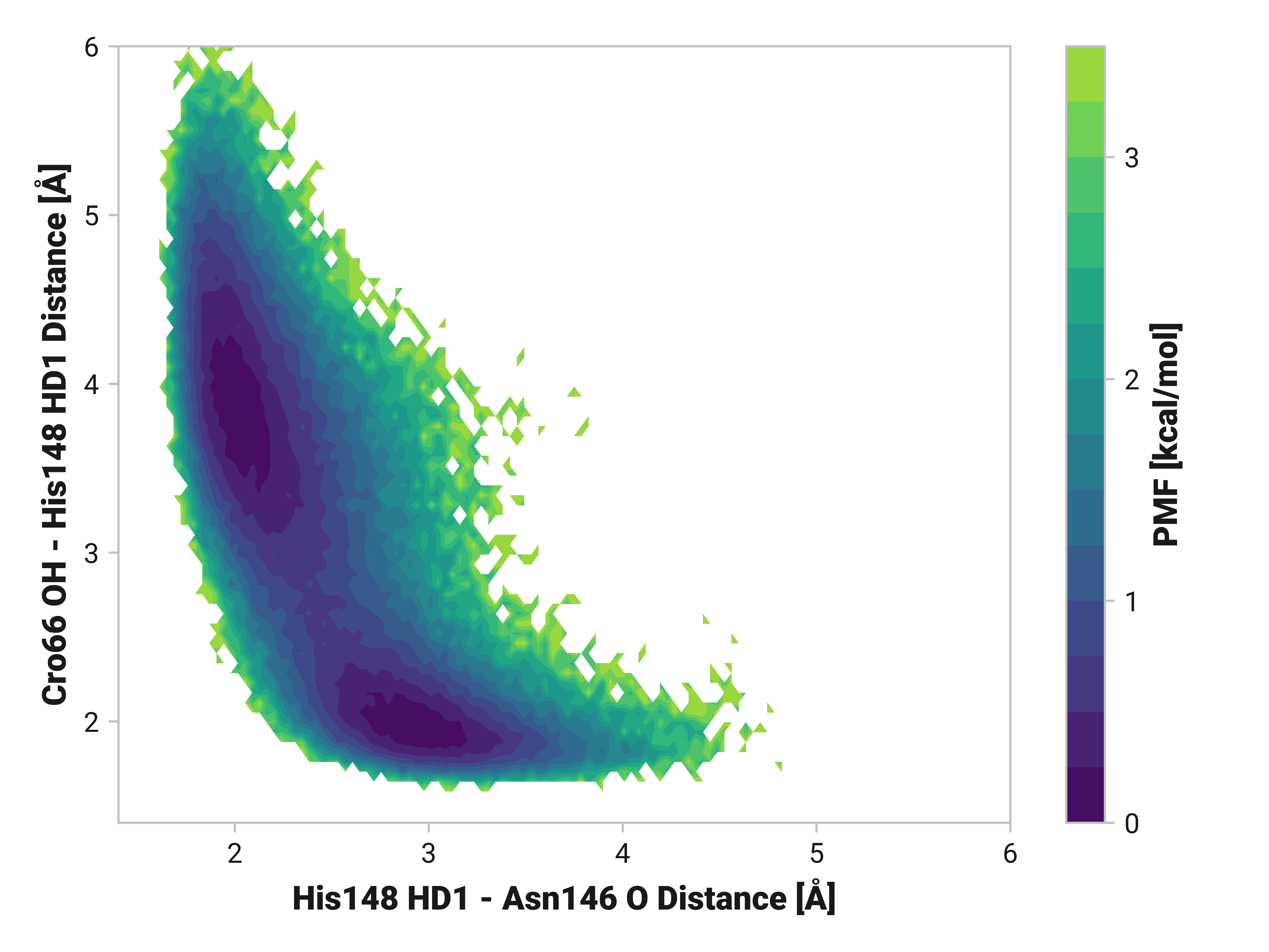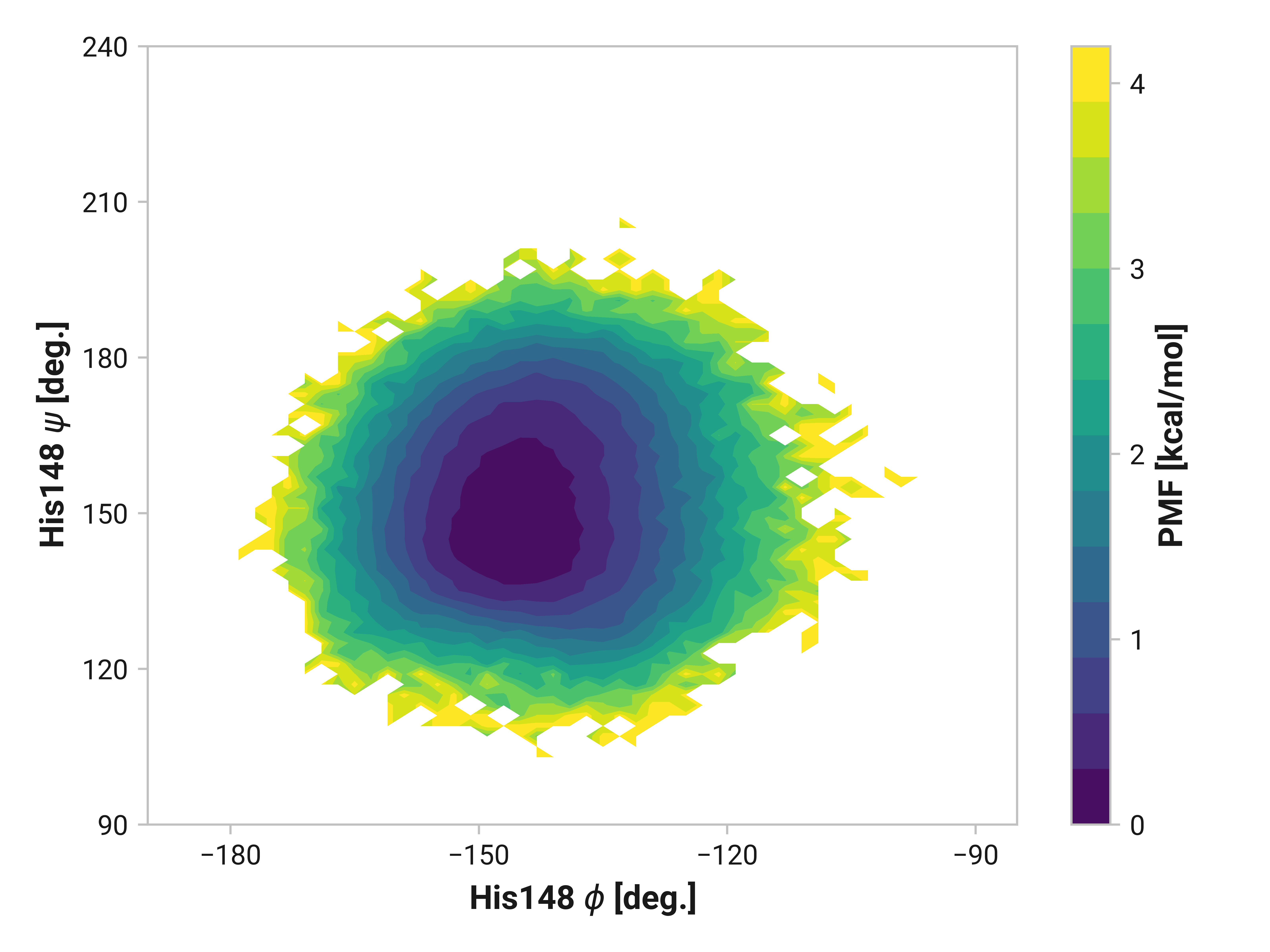 We can elucidate the mechanism by plotting 2D histograms of this His148 -NH to Thr203 =O distance with respect to relevant dihedral angles. If correlated, we would see distinct patterns in the PMFs.