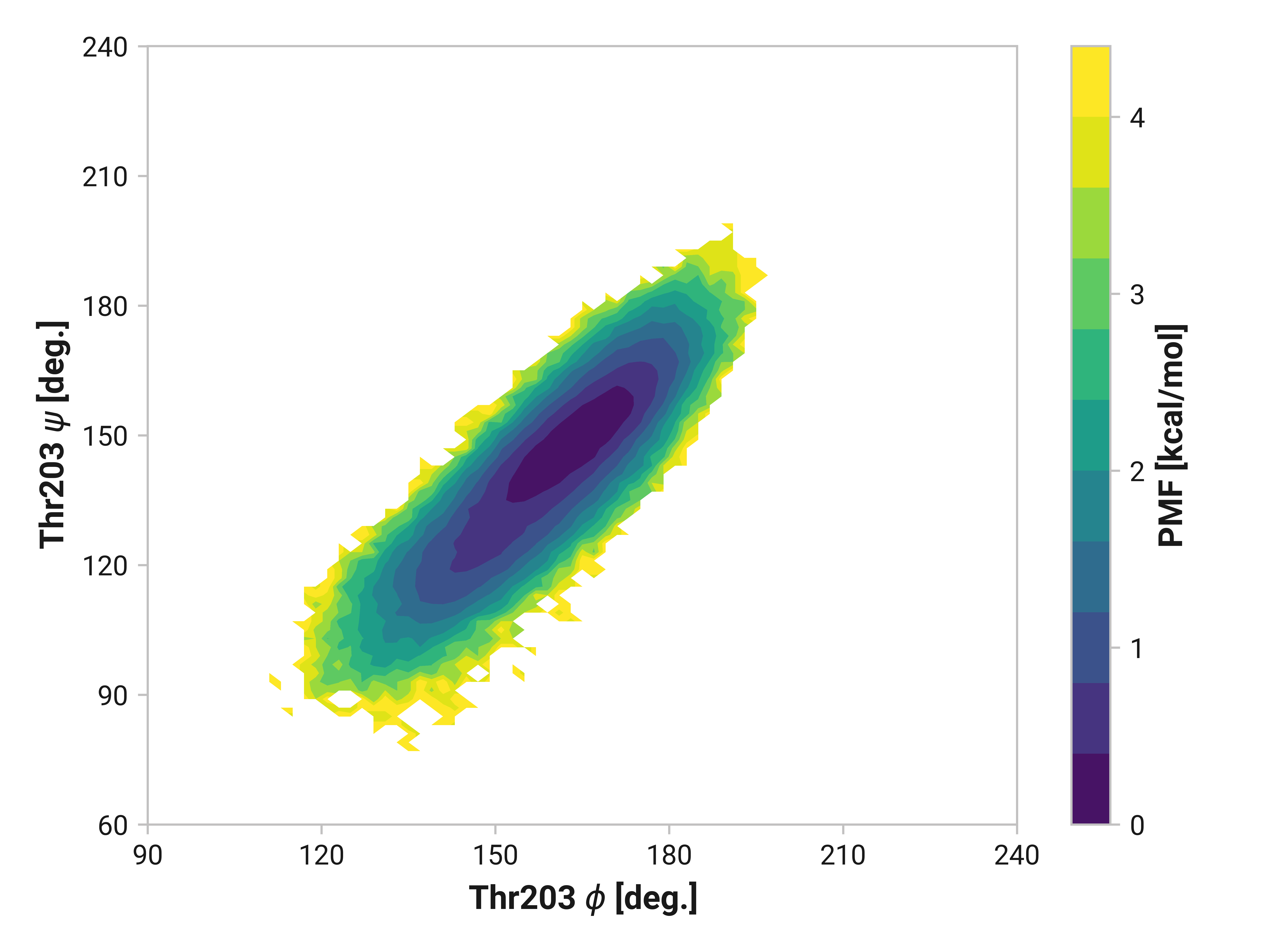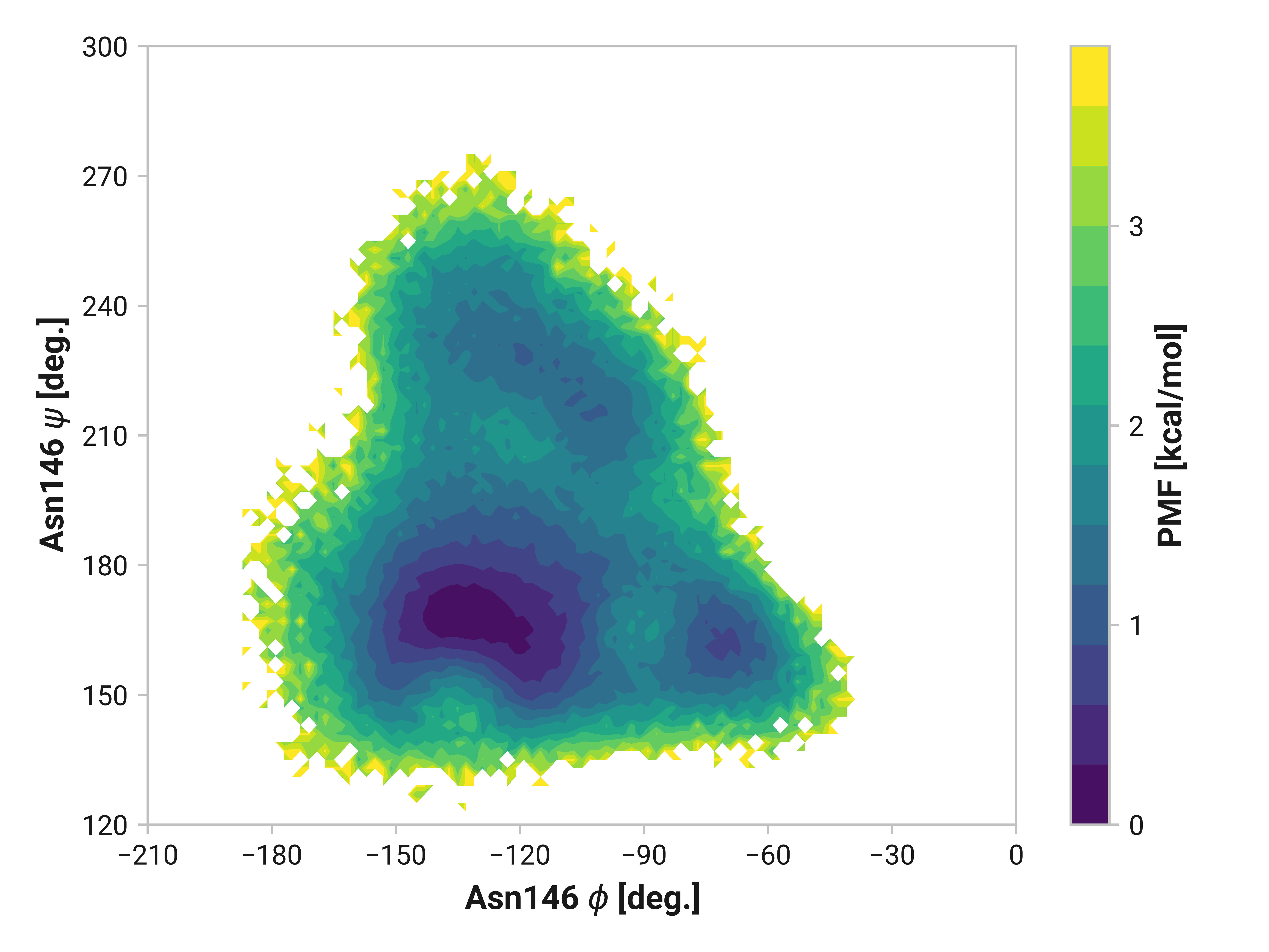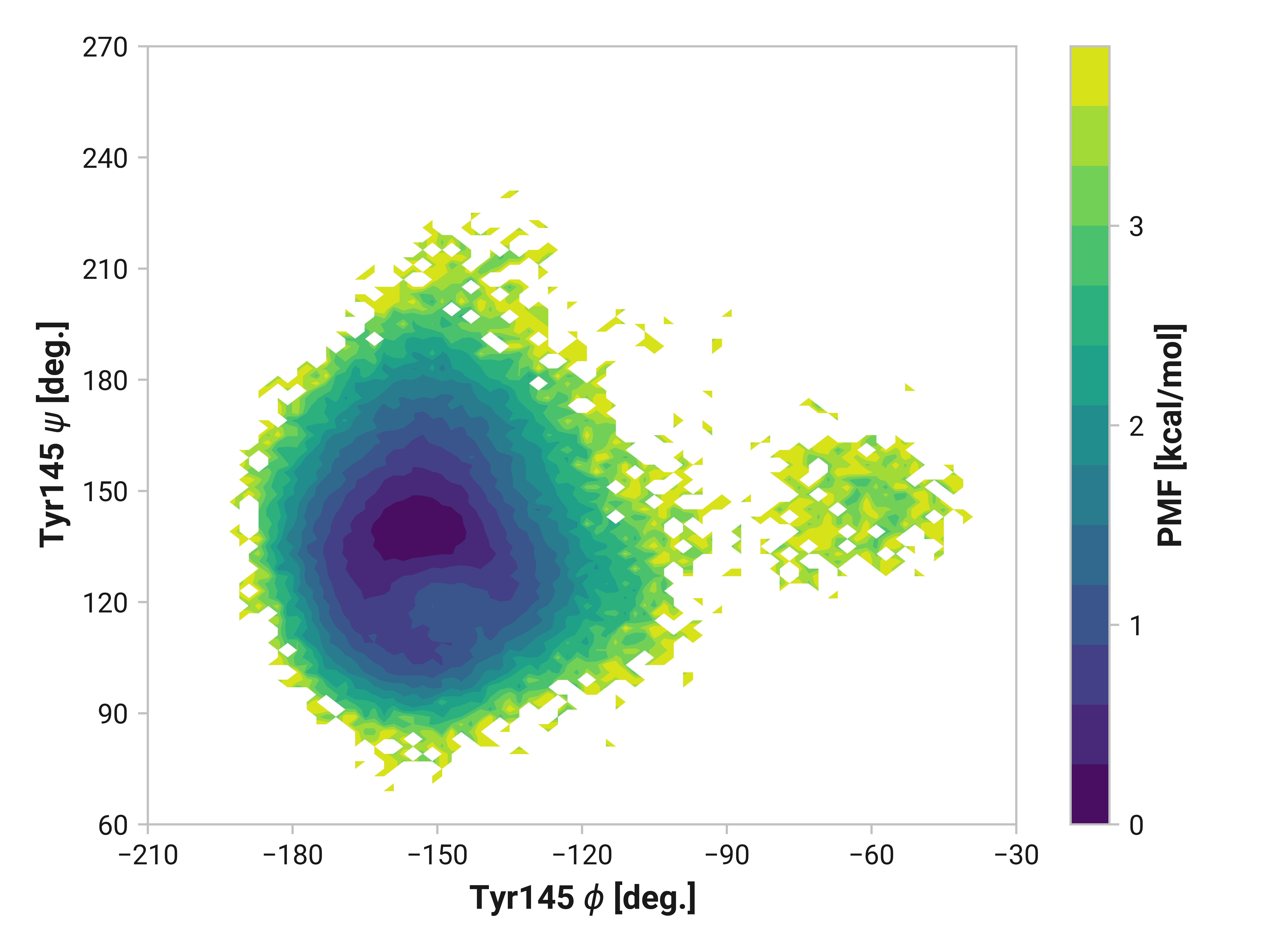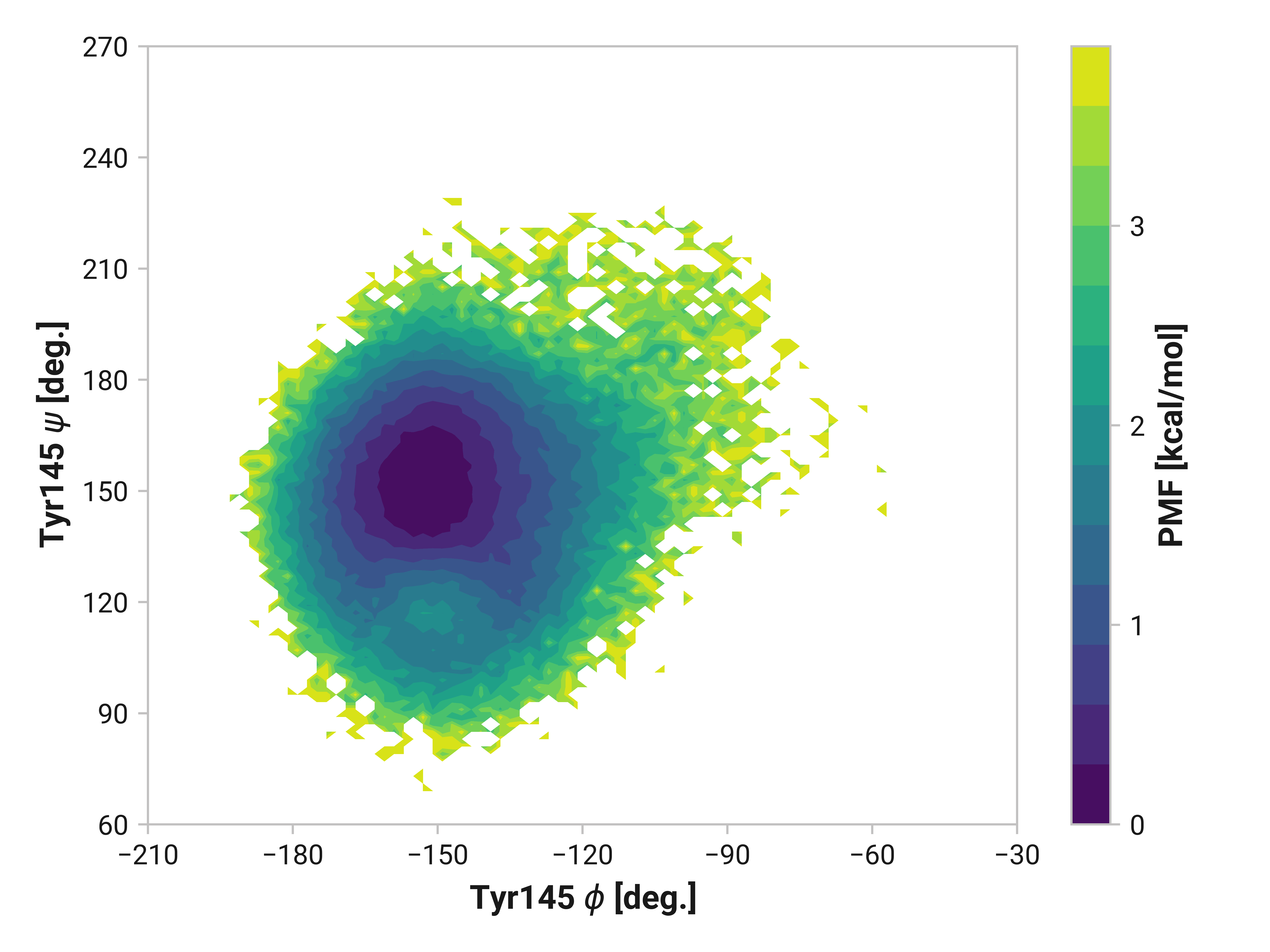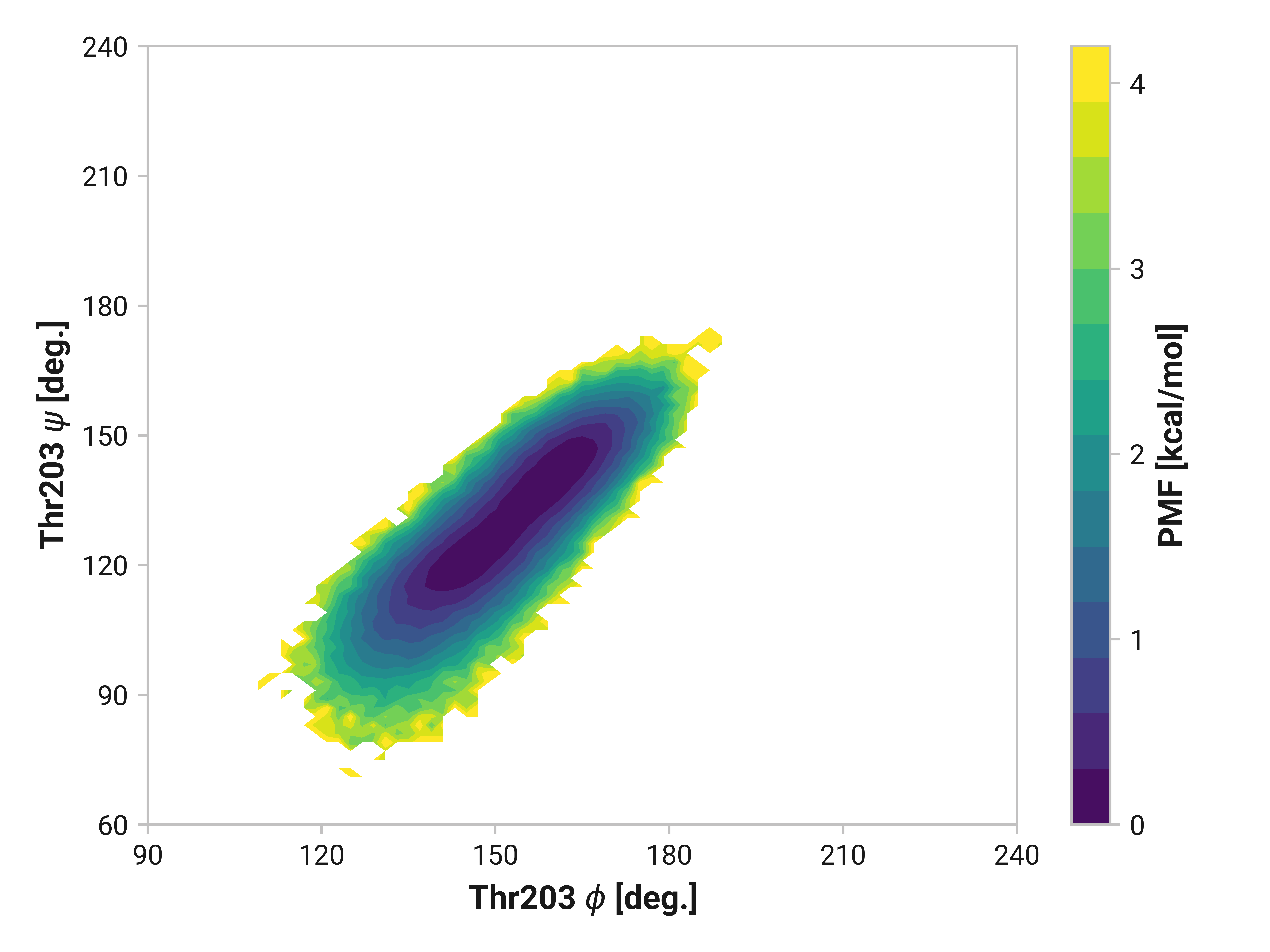 We can elucidate the mechanism by plotting 2D histograms of this His148 -NH to Thr203 =O distance with respect to relevant dihedral angles. If correlated, we would see distinct patterns in the PMFs.