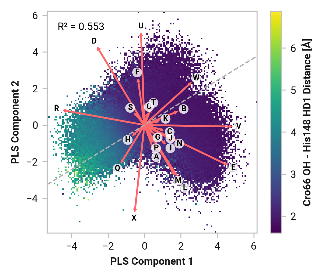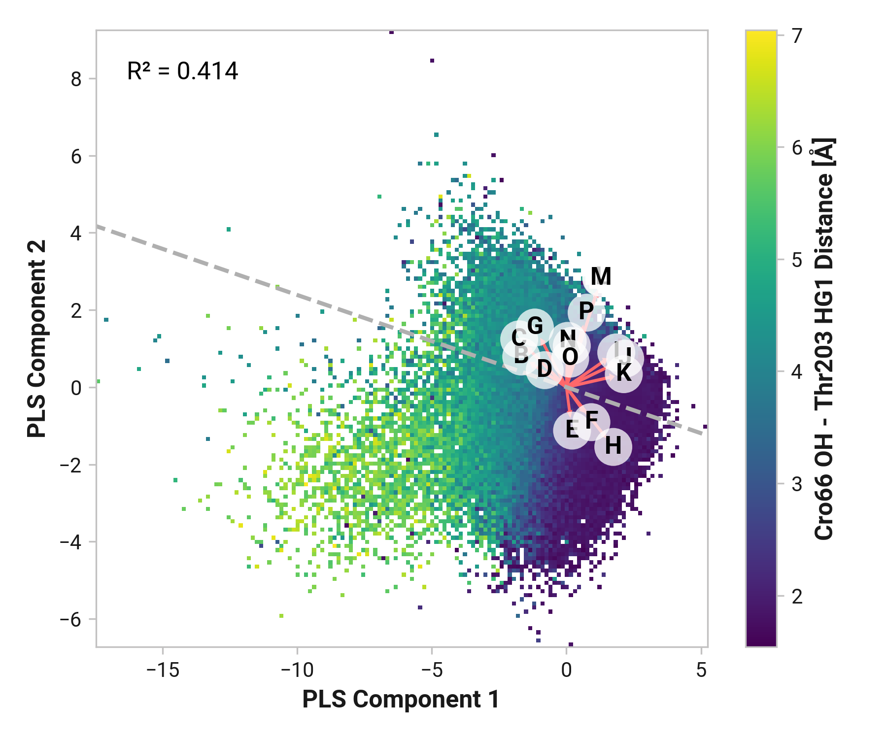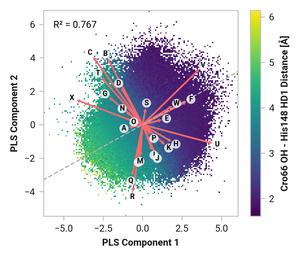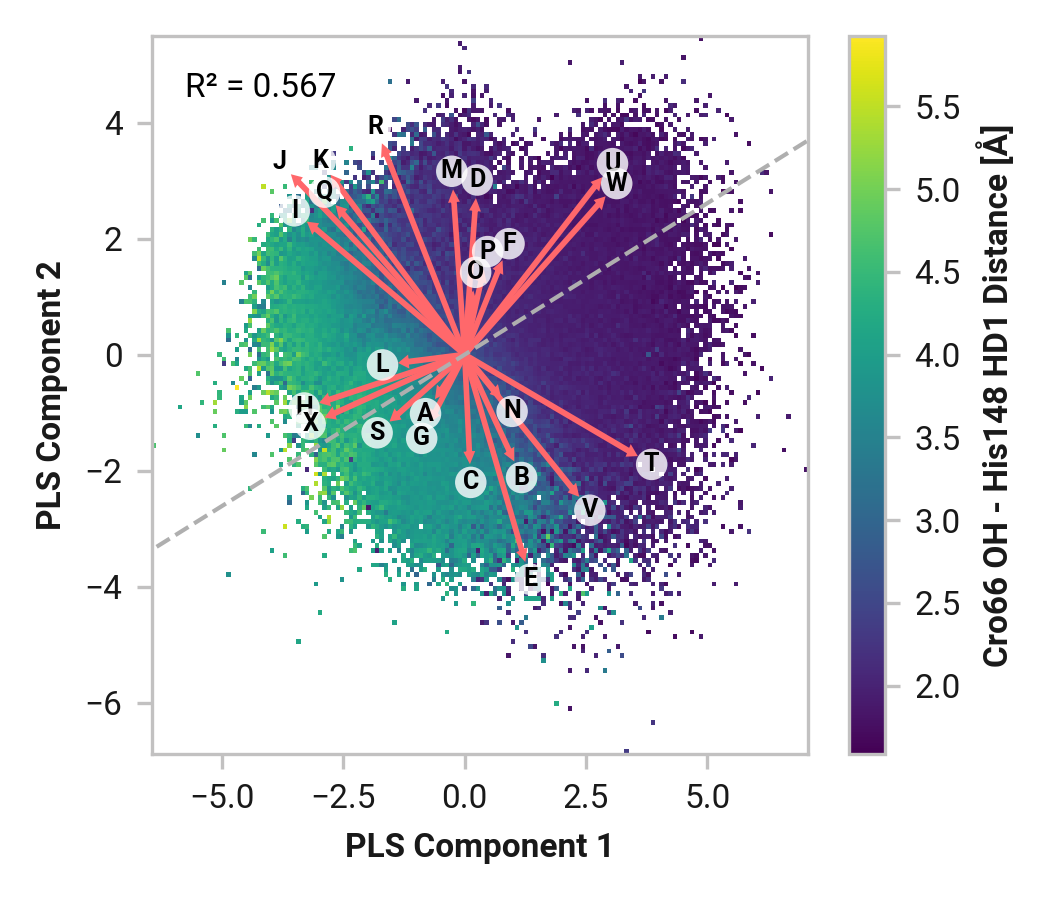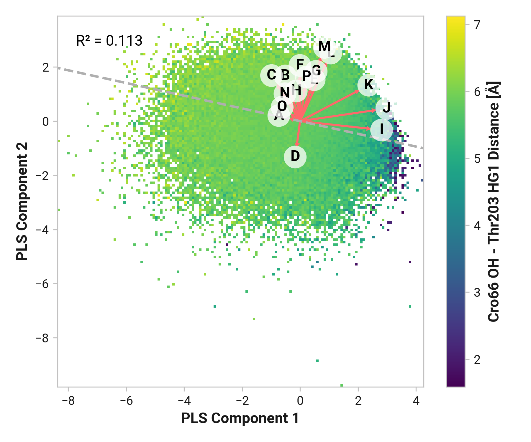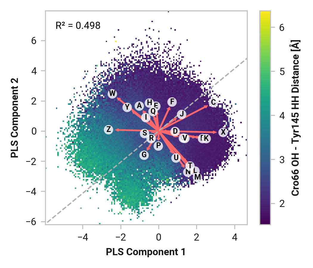 We first employed Partial Least Squares (PLS) regression to probe relationships between Cys147 and Cys204 adjacent backbone and His148 stabilization of Cro66.