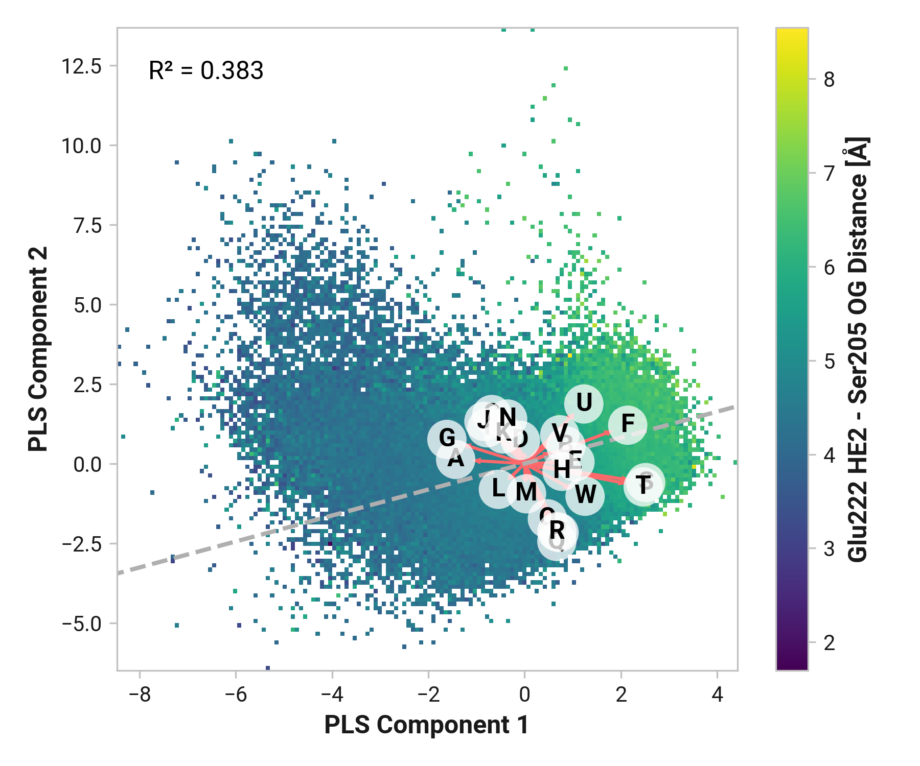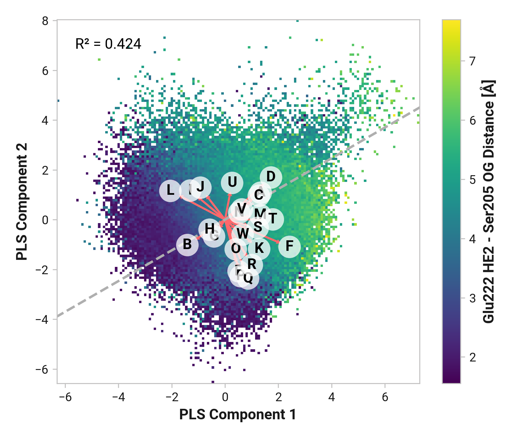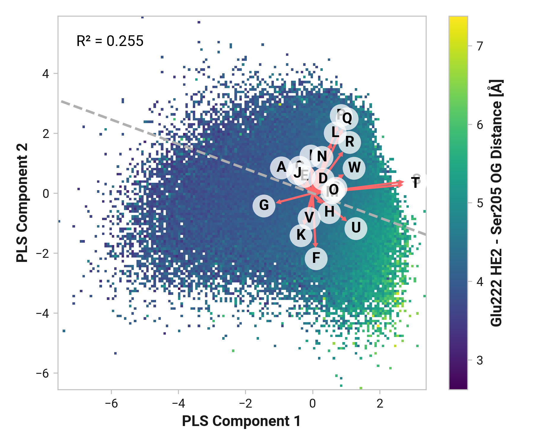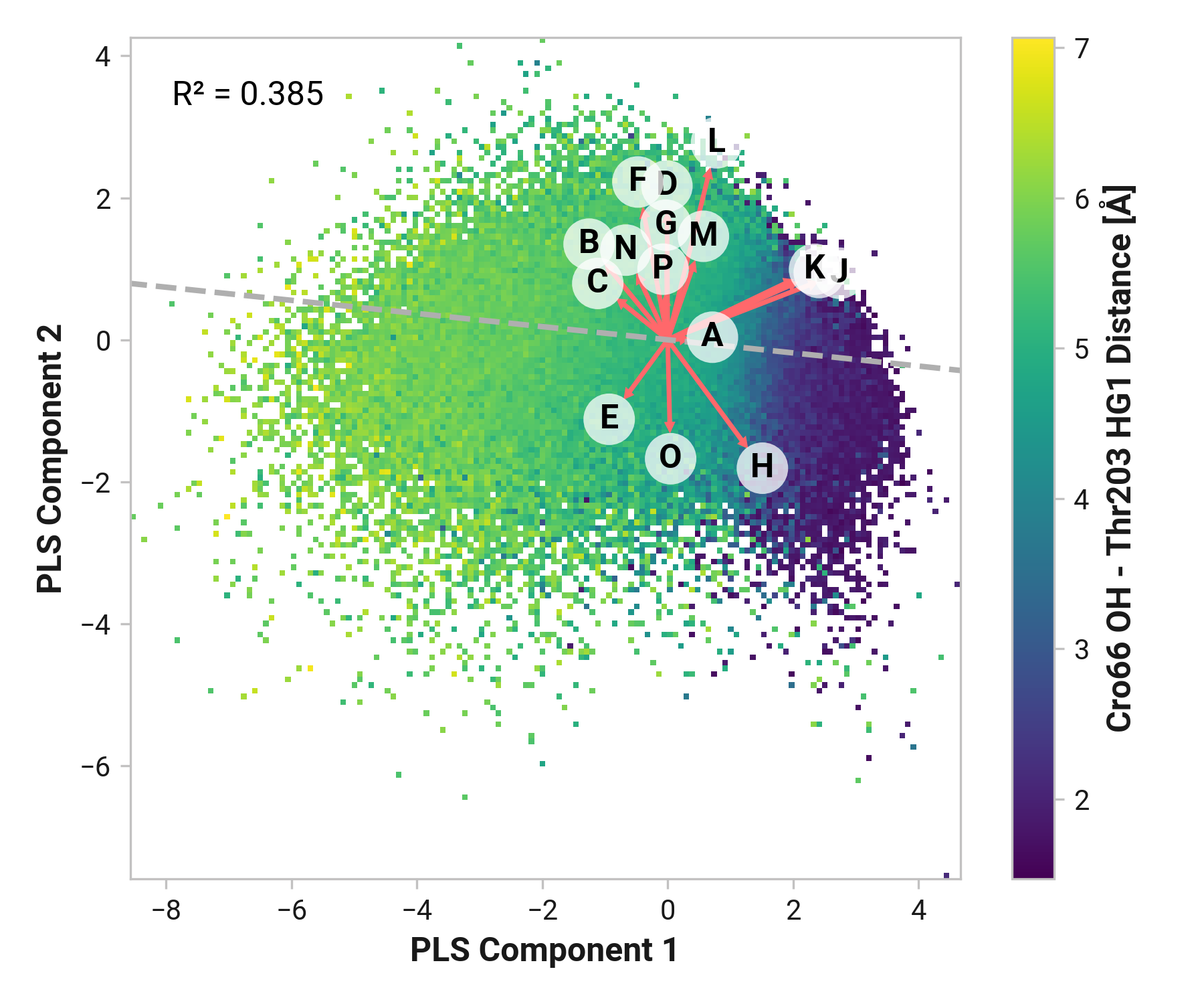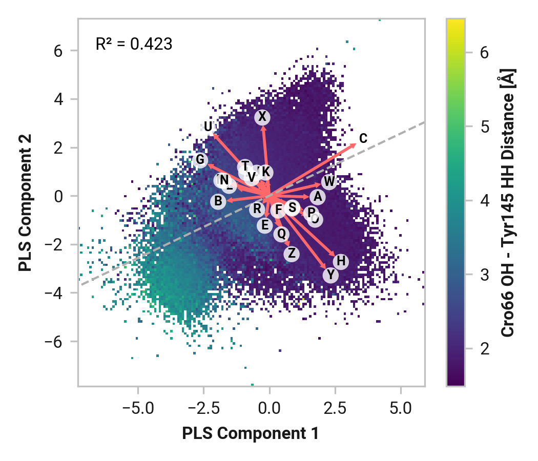 We first employed Partial Least Squares (PLS) regression to probe relationships between Cys147 and Cys204 adjacent backbone and His148 stabilization of Cro66.