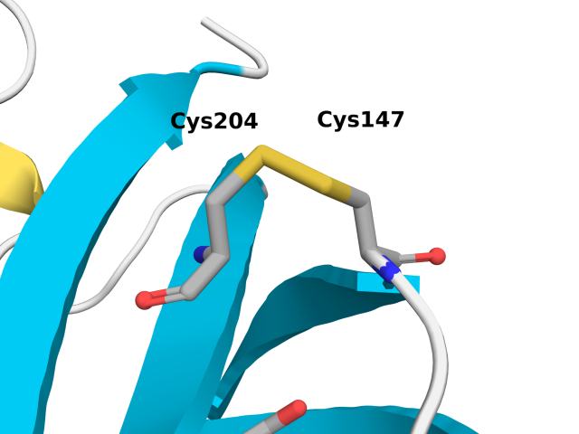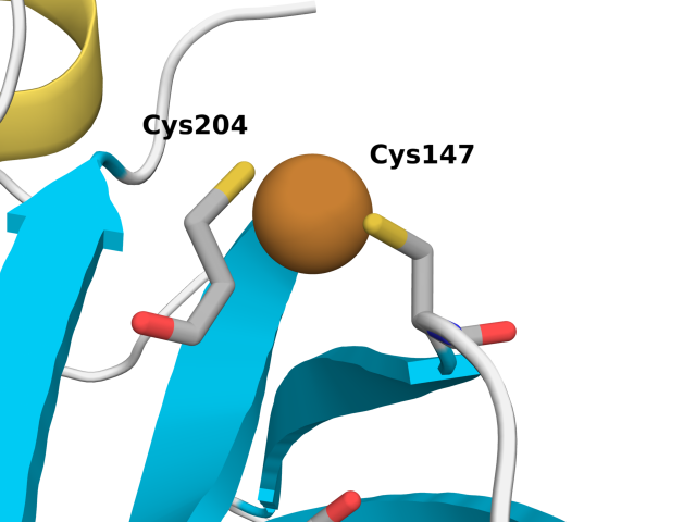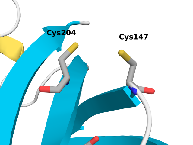 Forming a disulfide bond between Cys147 and Cys204 substantially stabilizes the beta-sheet. Indeed, the hydrogen bonding probability increases from 0.865 to 0.997 when using a H to O cutoff of 2.5 Å. (For a cutoff rationale, please see our protocol.) Cu(I) binding induces the opposite effect by destabilizing the beta strand with a probability of 0.063 of forming the hydrogen bond.