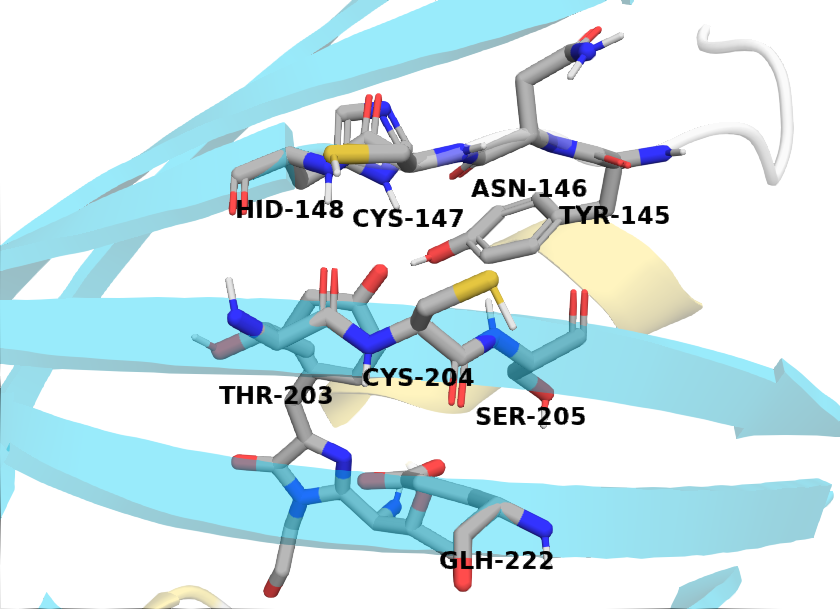 | D: Asn144-C Tyr145-N-CA-C dihedral | -1.3634 | -0.9555 (+0.4079) | -0.8011 (+0.5623) |