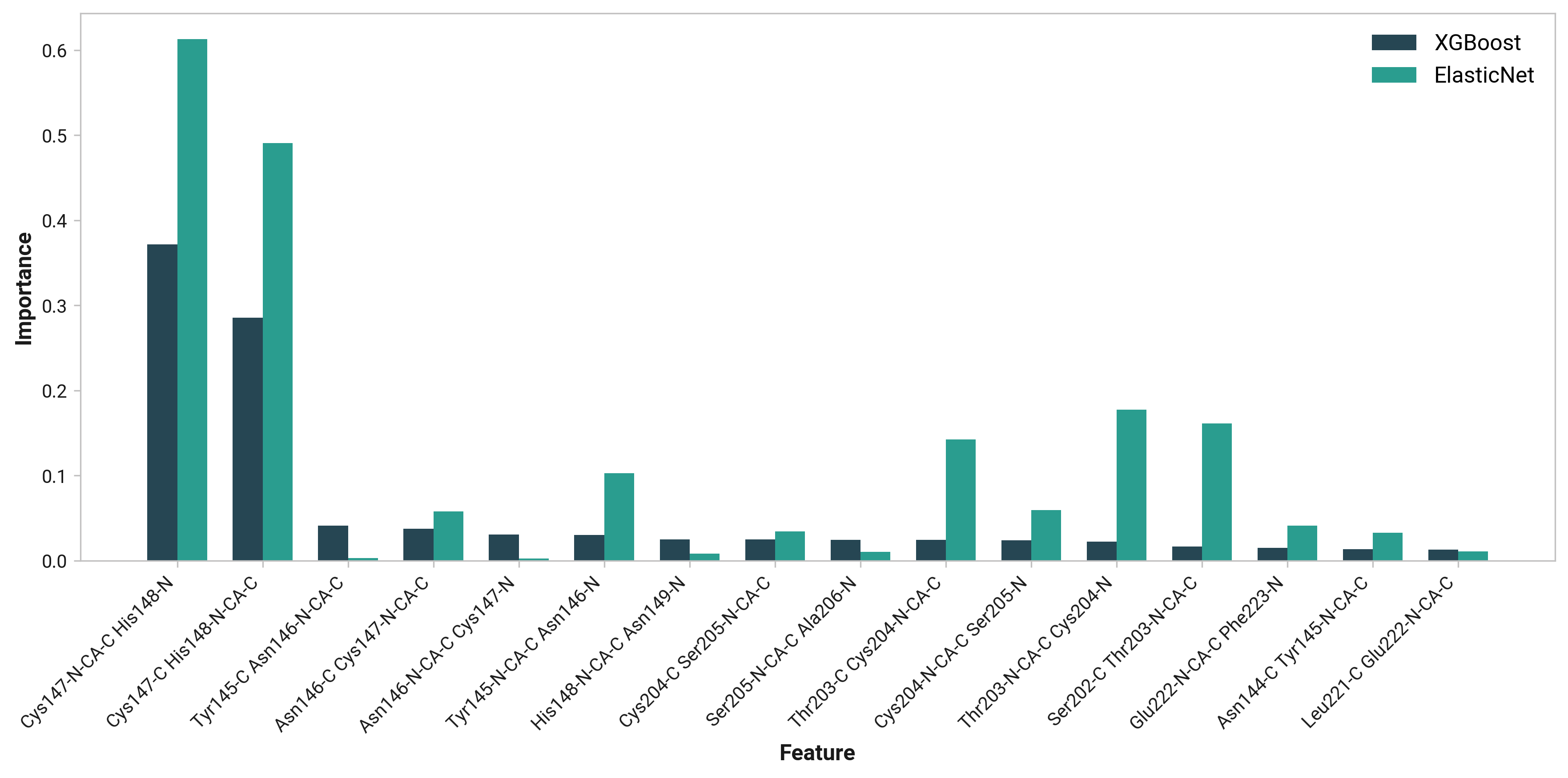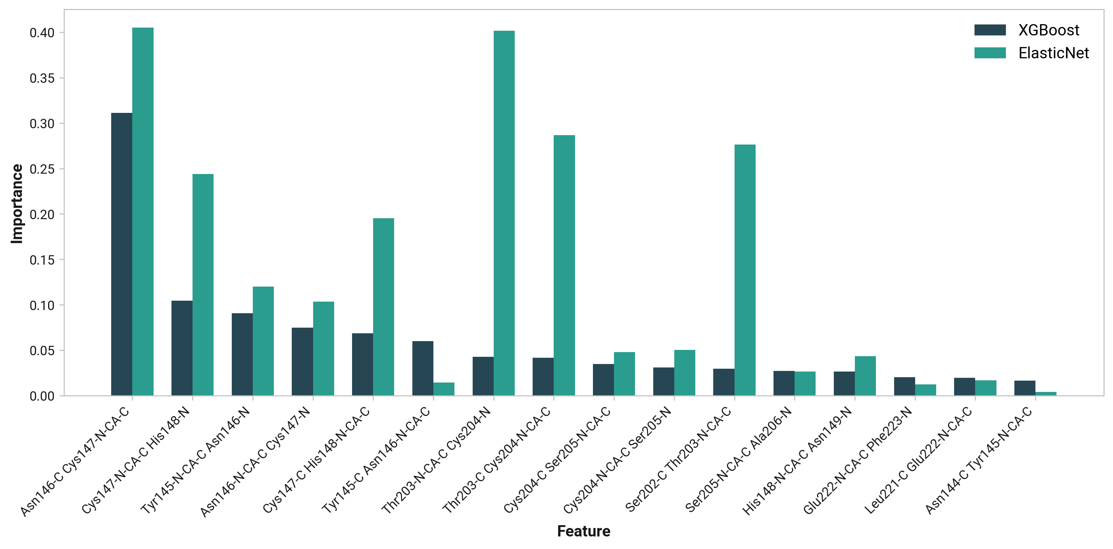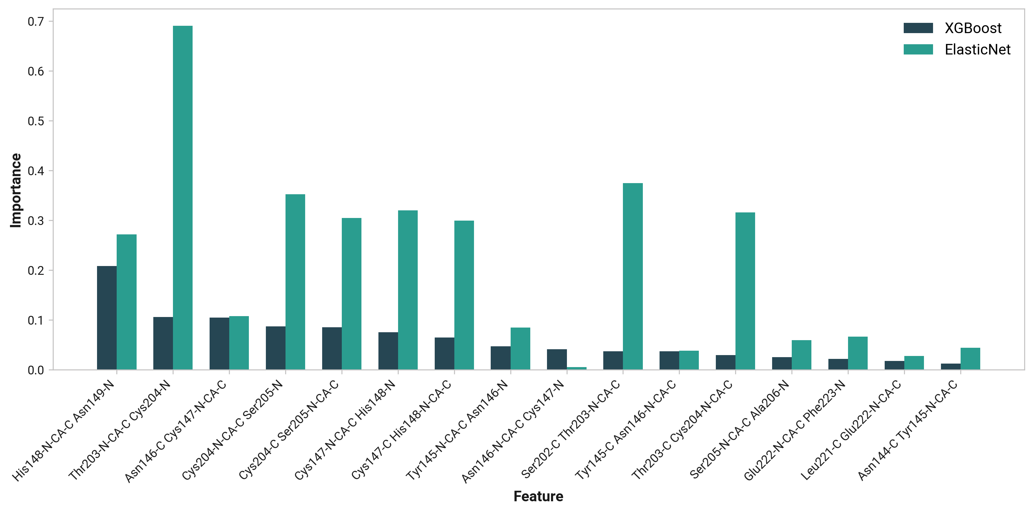 To extend these findings, we employed two machine learning models: XGBoost and ElasticNet. These models provided feature importance scores, offering an additional perspective on the relative significance of each dihedral angle in determining His148's conformation.