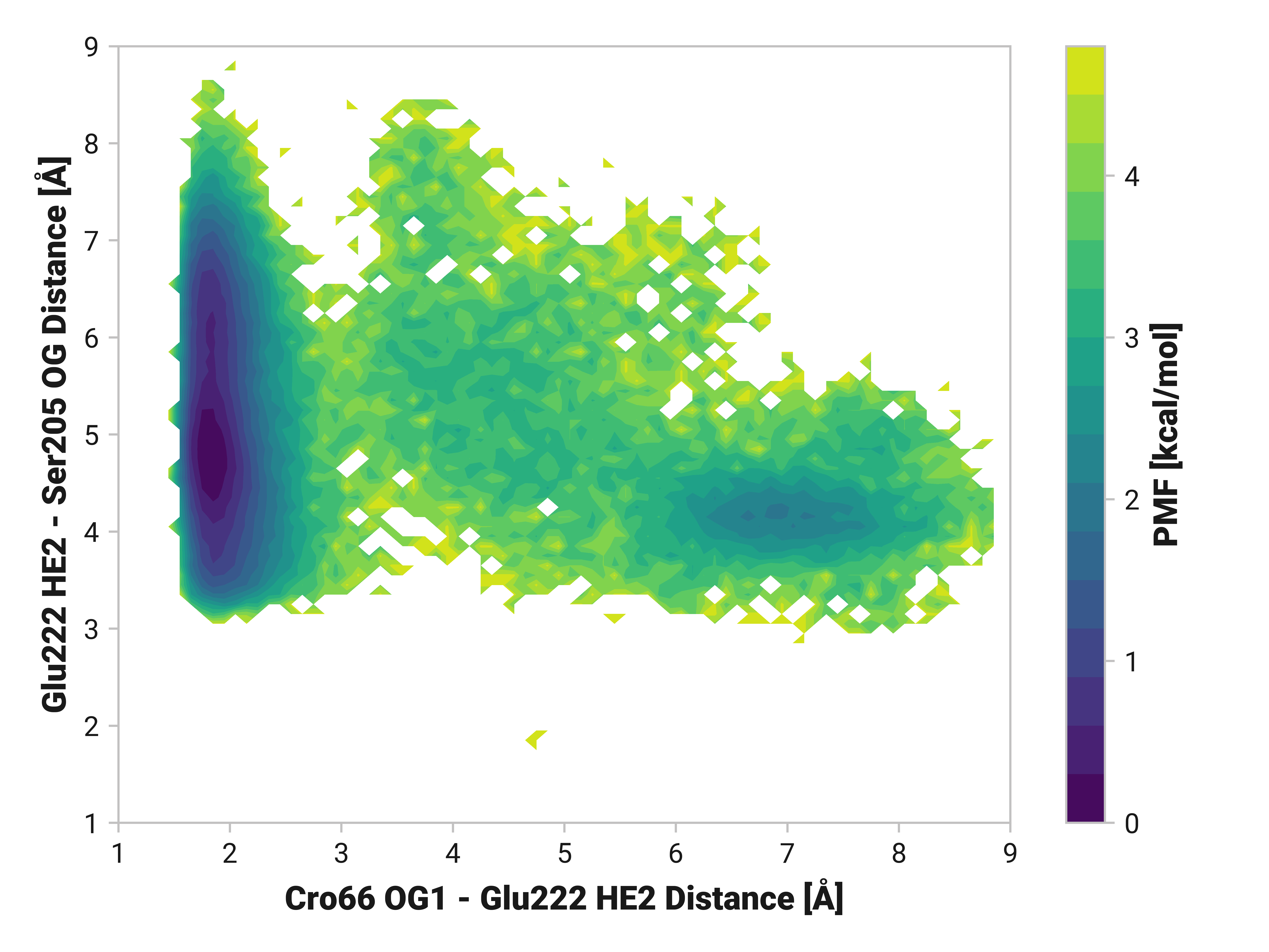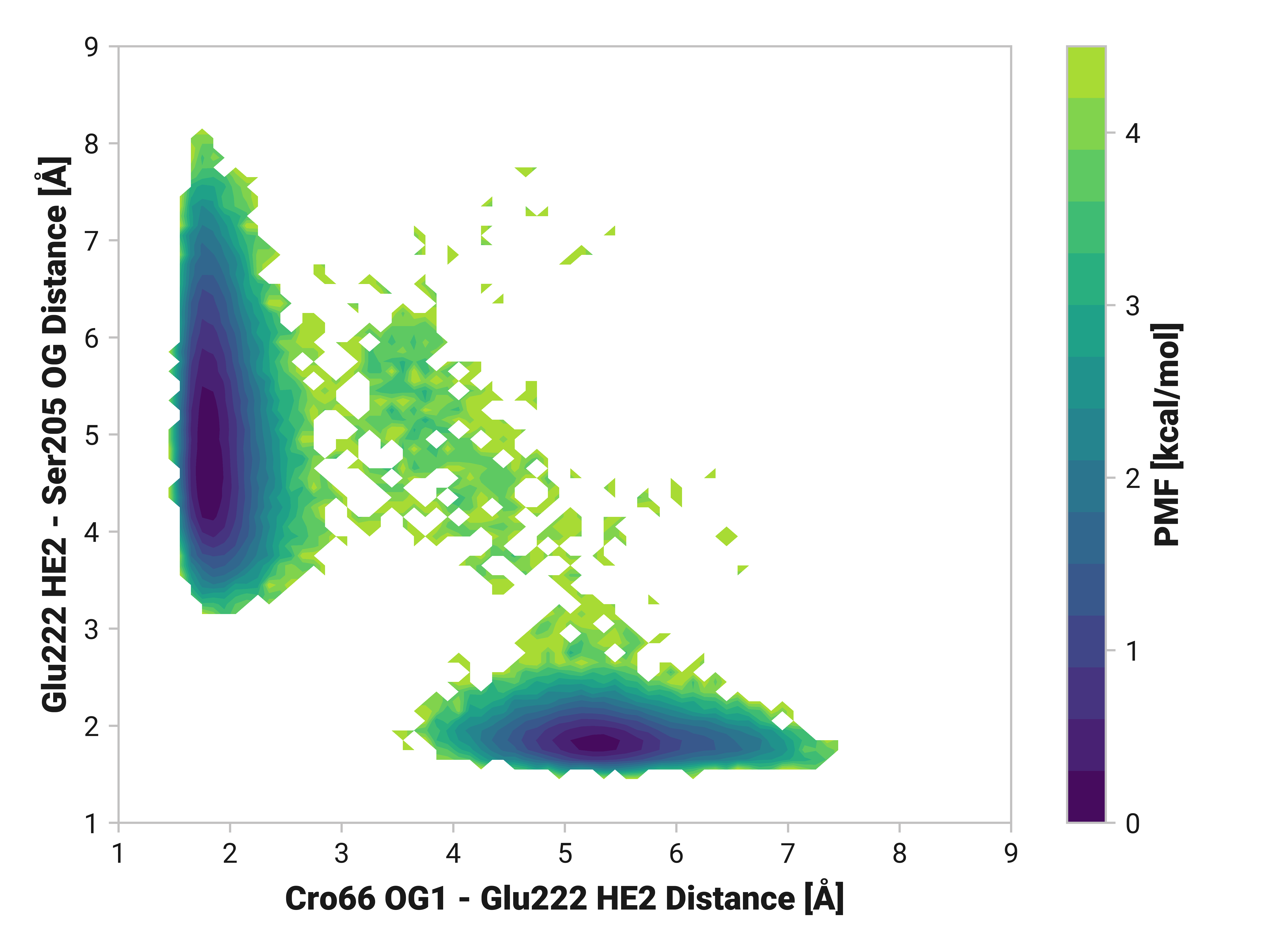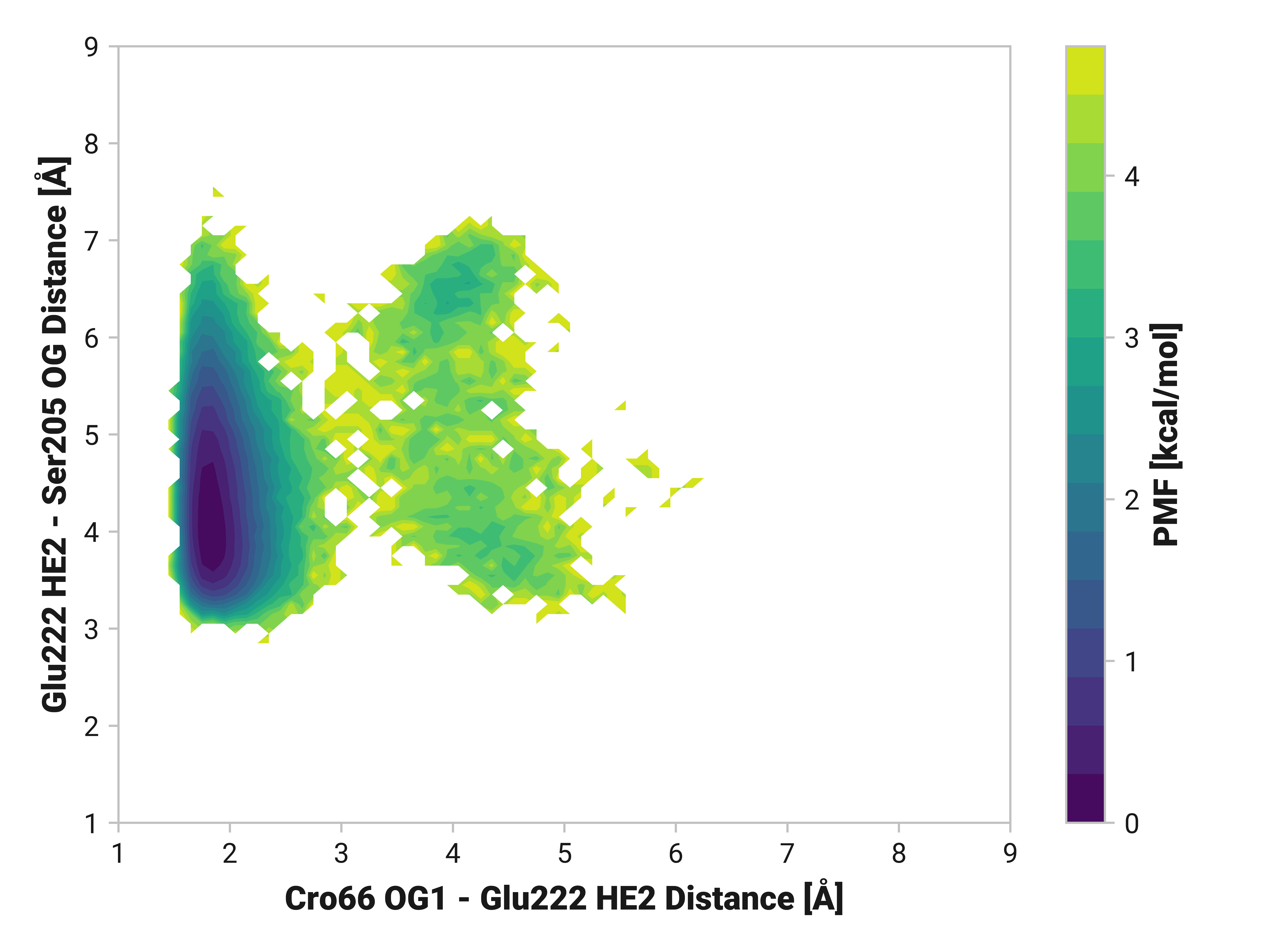 G011: Glu222 to Cro66 and Ser205 distance¶ Probability densities¶ ReducedOxidizedCu(I) Visualization¶