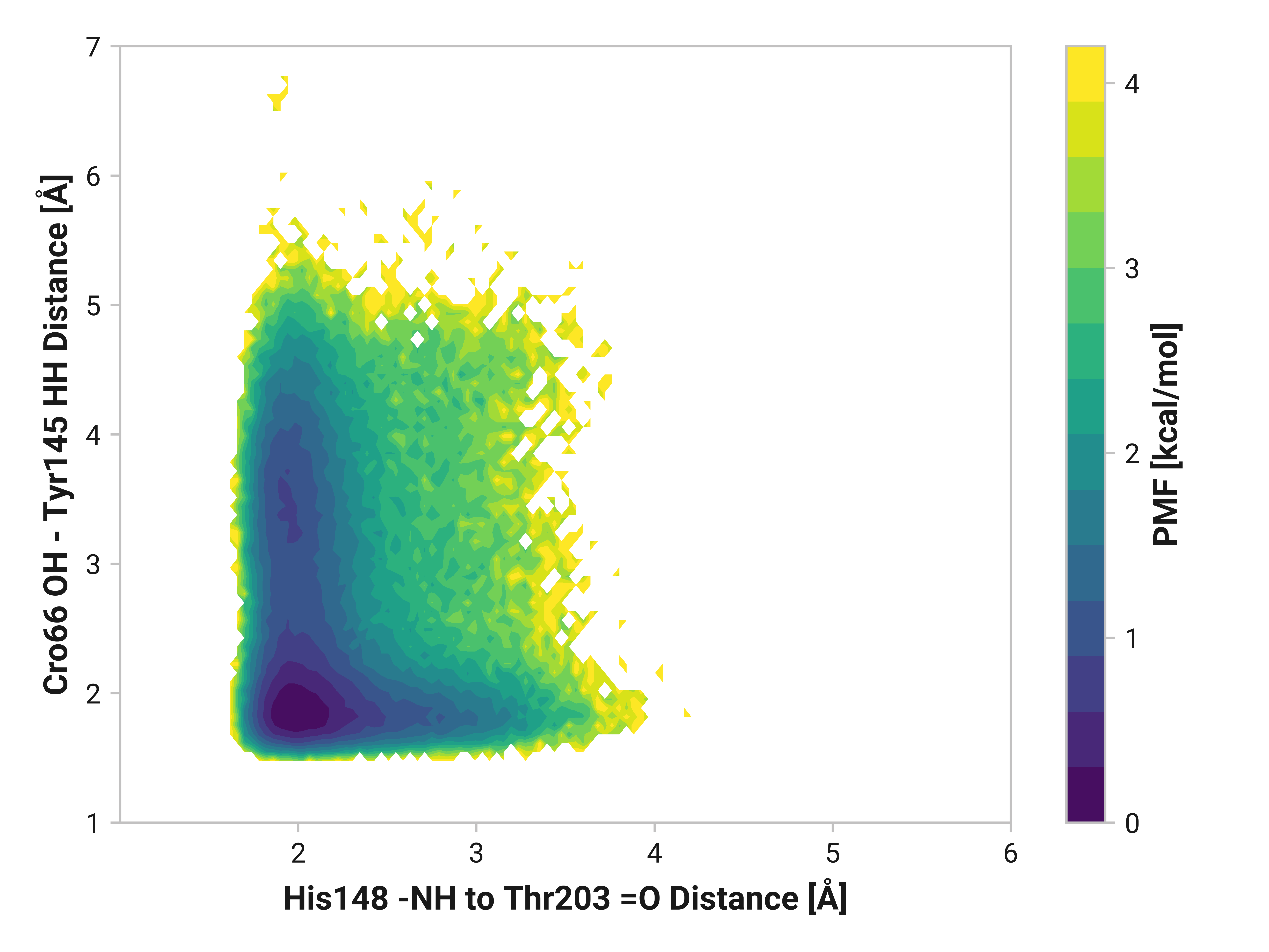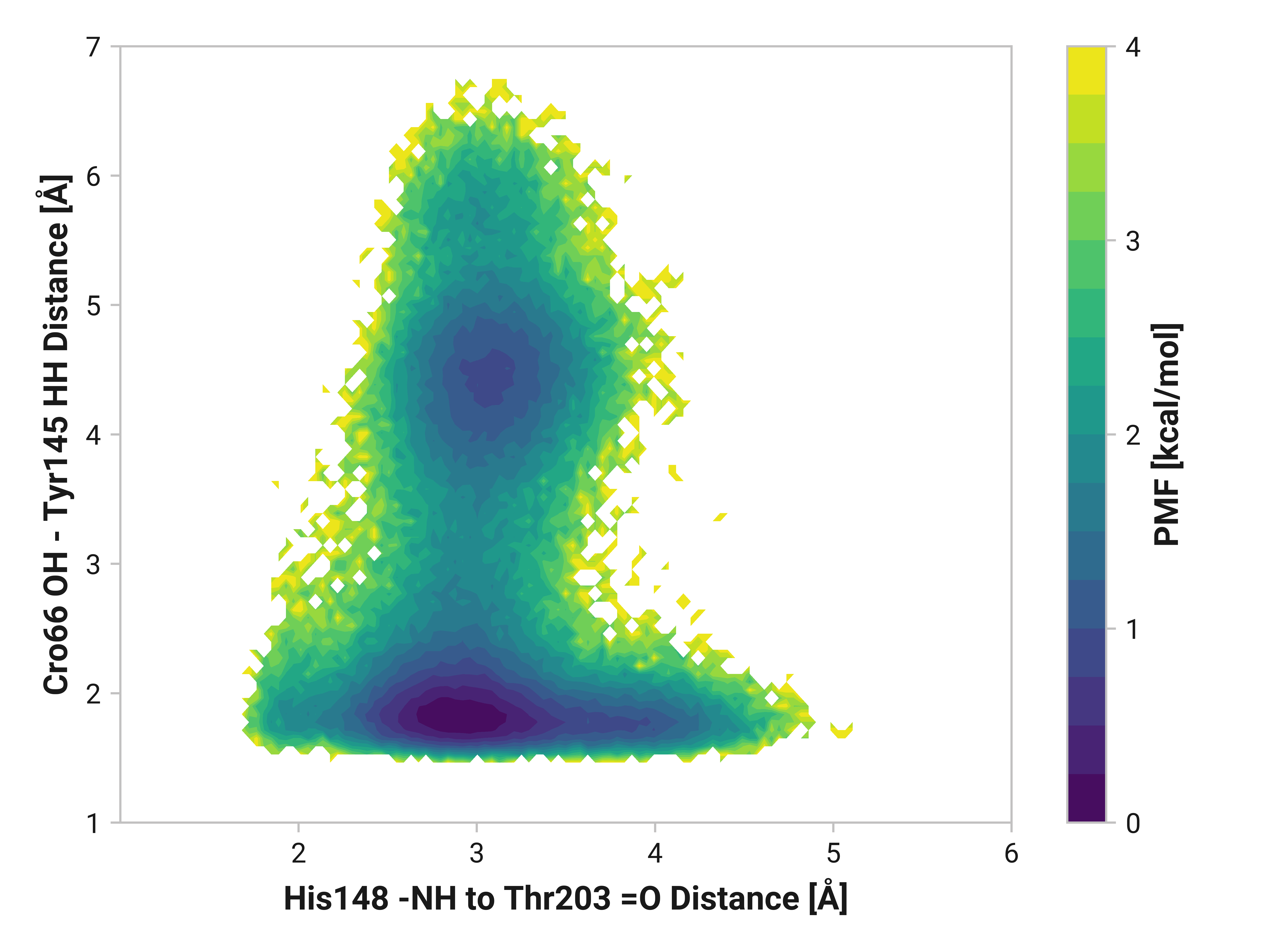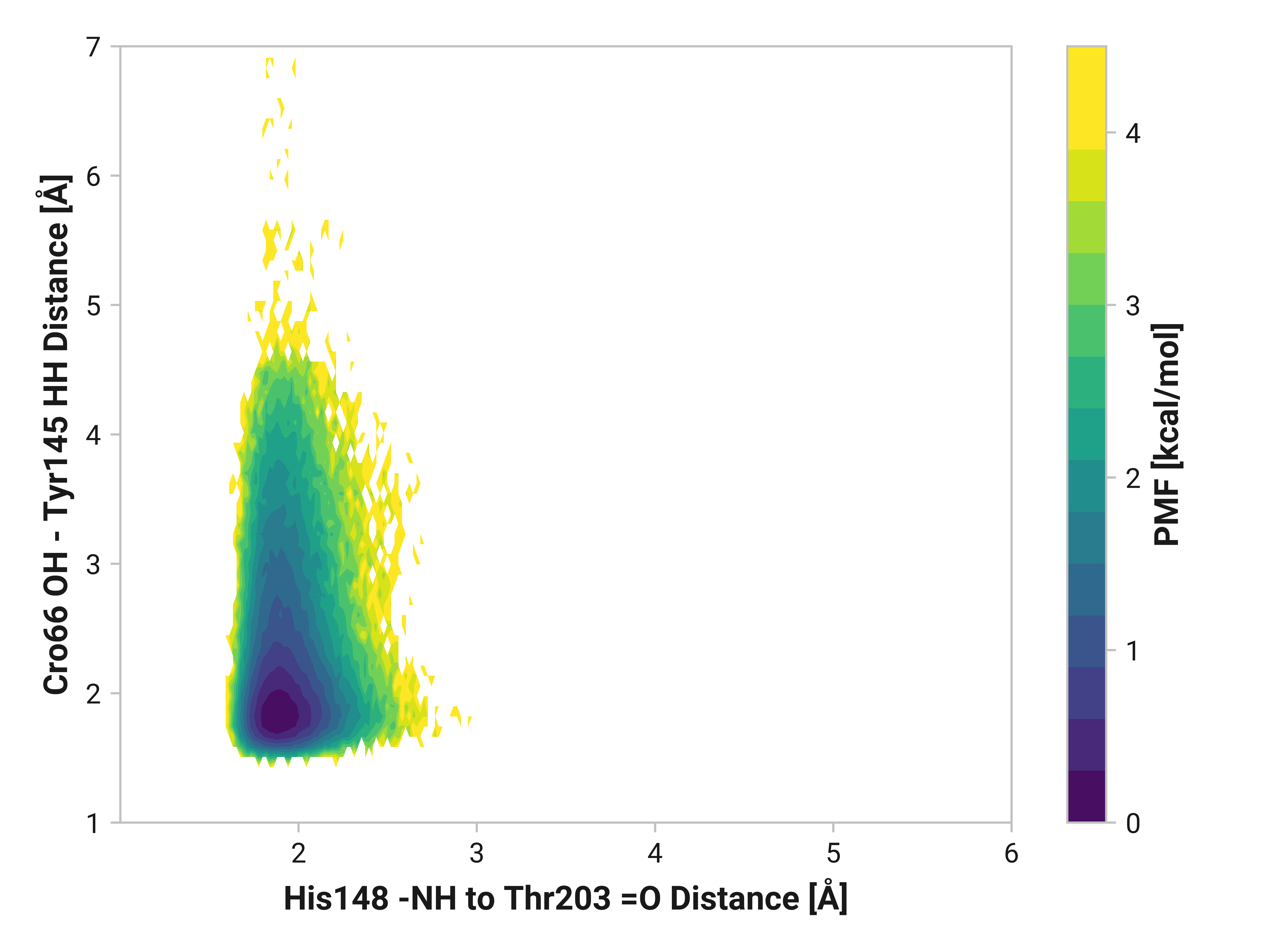 I008: Tyr145 HH bonding to Cro66-OH vs. Asn146-O¶ Potential of mean force¶ ReducedOxidizedCu(I) Visualization¶